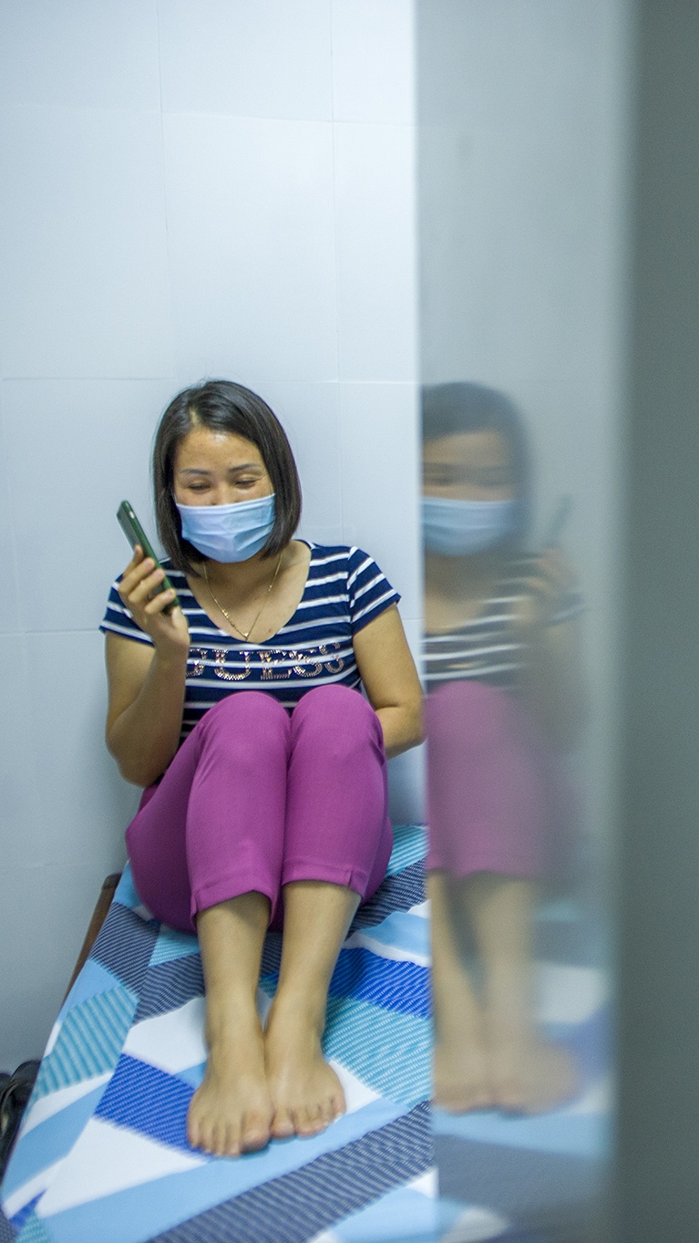| Một nữ điều dưỡng tranh thủ gọi điện thoại về cho người thân sau ca trực. Chỉ 15 phút sau, chị mặc trang phục bảo hộ vào phía trong nơi điều trị vì có bệnh nhân yêu cầu hỗ trợ. |