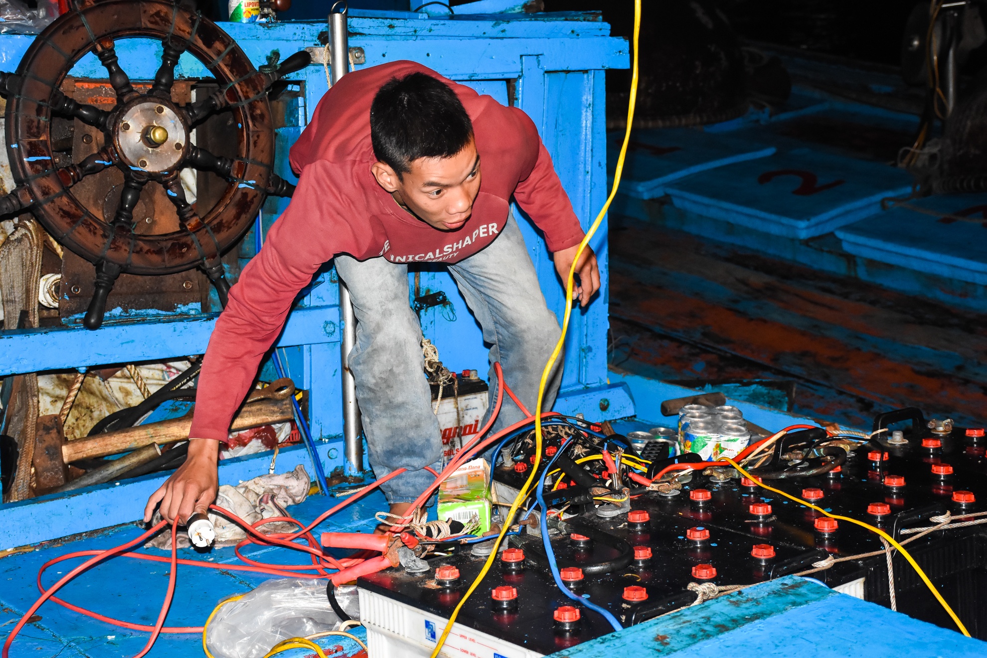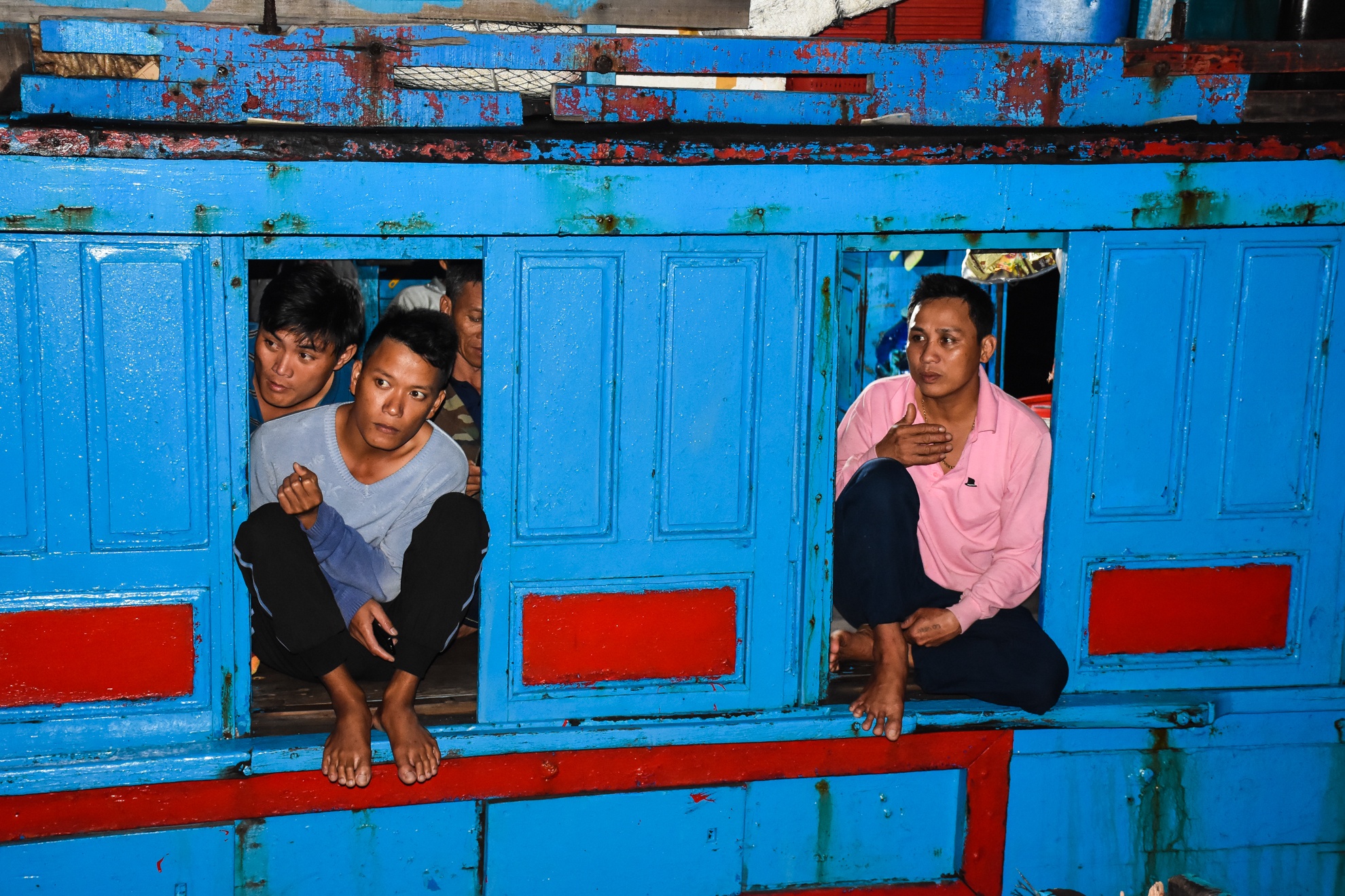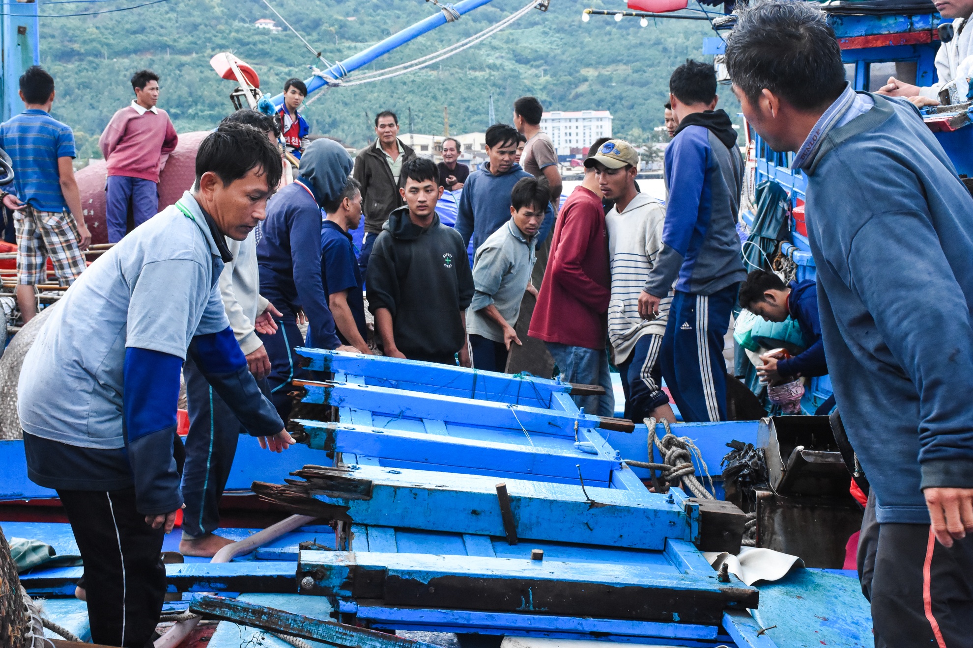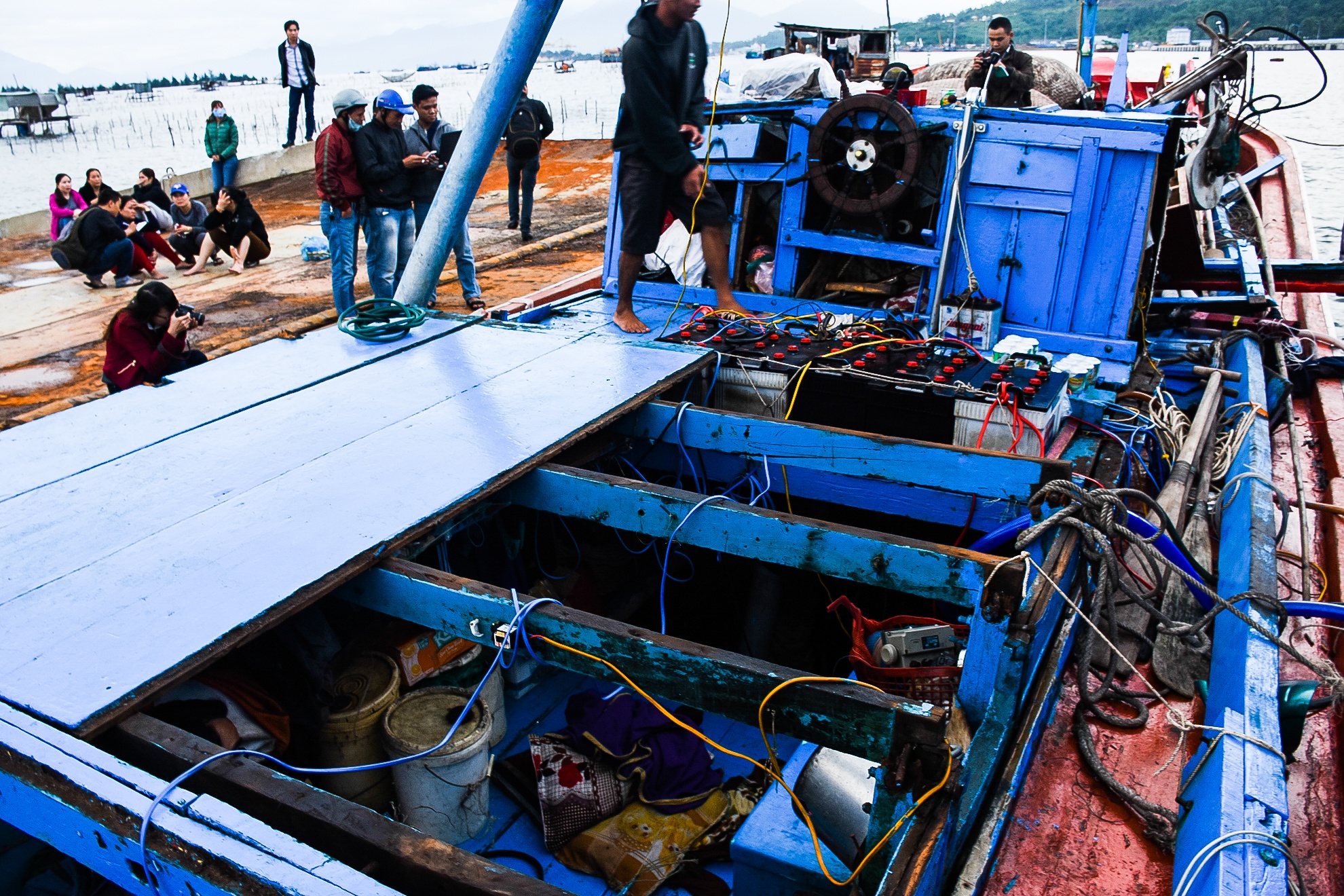 Cảnh tan hoang của tàu cá bị tông chìm Đang khai thác hải sản trong vùng biển Việt Nam, tàu cá của ông Hợp bị một tàu vỏ sắt của nước ngoài tông chìm. 10 ngư dân thoát nạn nhưng toàn bộ tài sản bị hư hỏng.