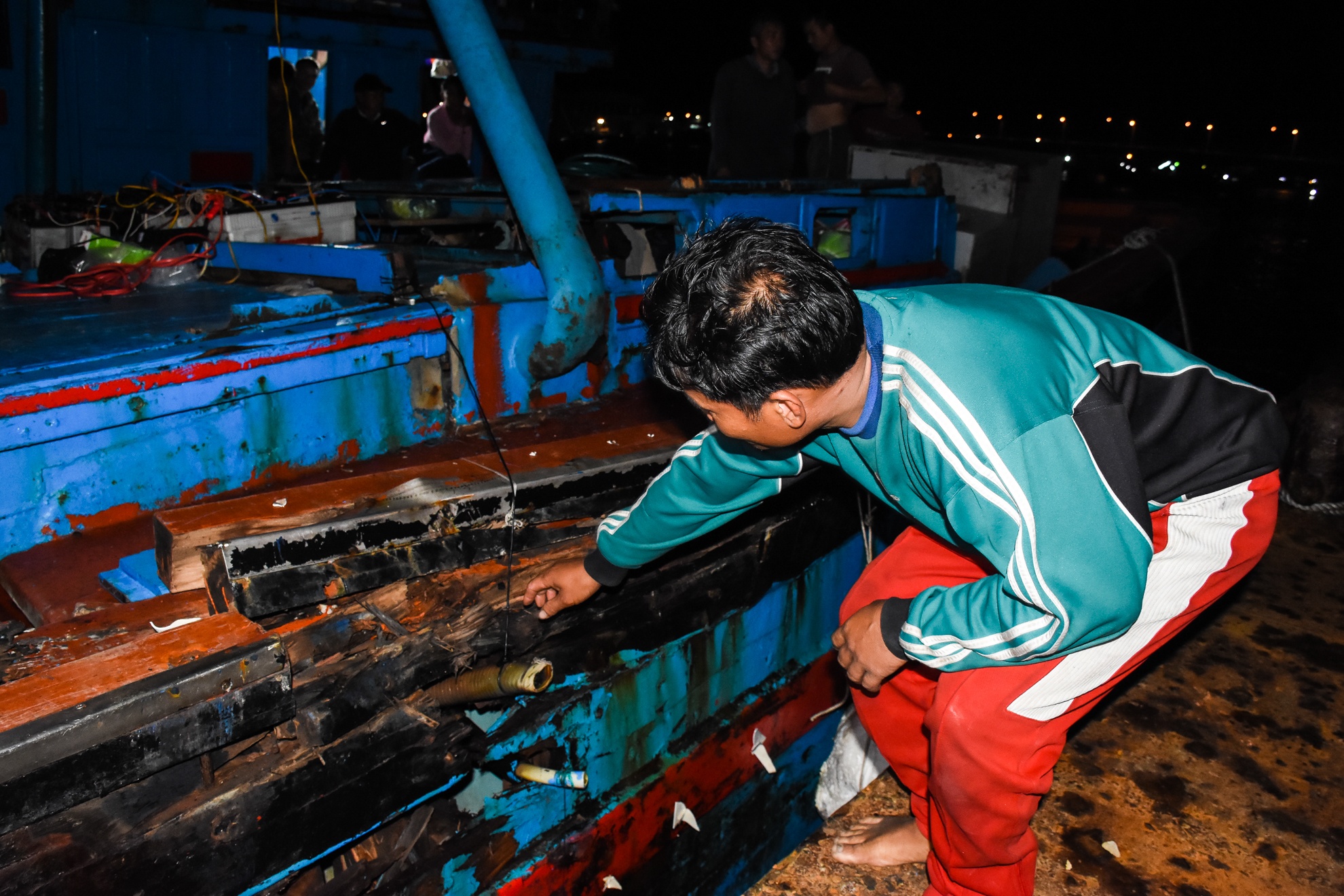 "Khi ngư dân đang ngủ thì nghe tiếng rầm rất lớn, tất cả anh em văng xuống biển. Thấy tàu 0009880, chúng tôi kêu cứu nhưng họ lại đâm thêm lần nữa", ngư dân Giao kể.