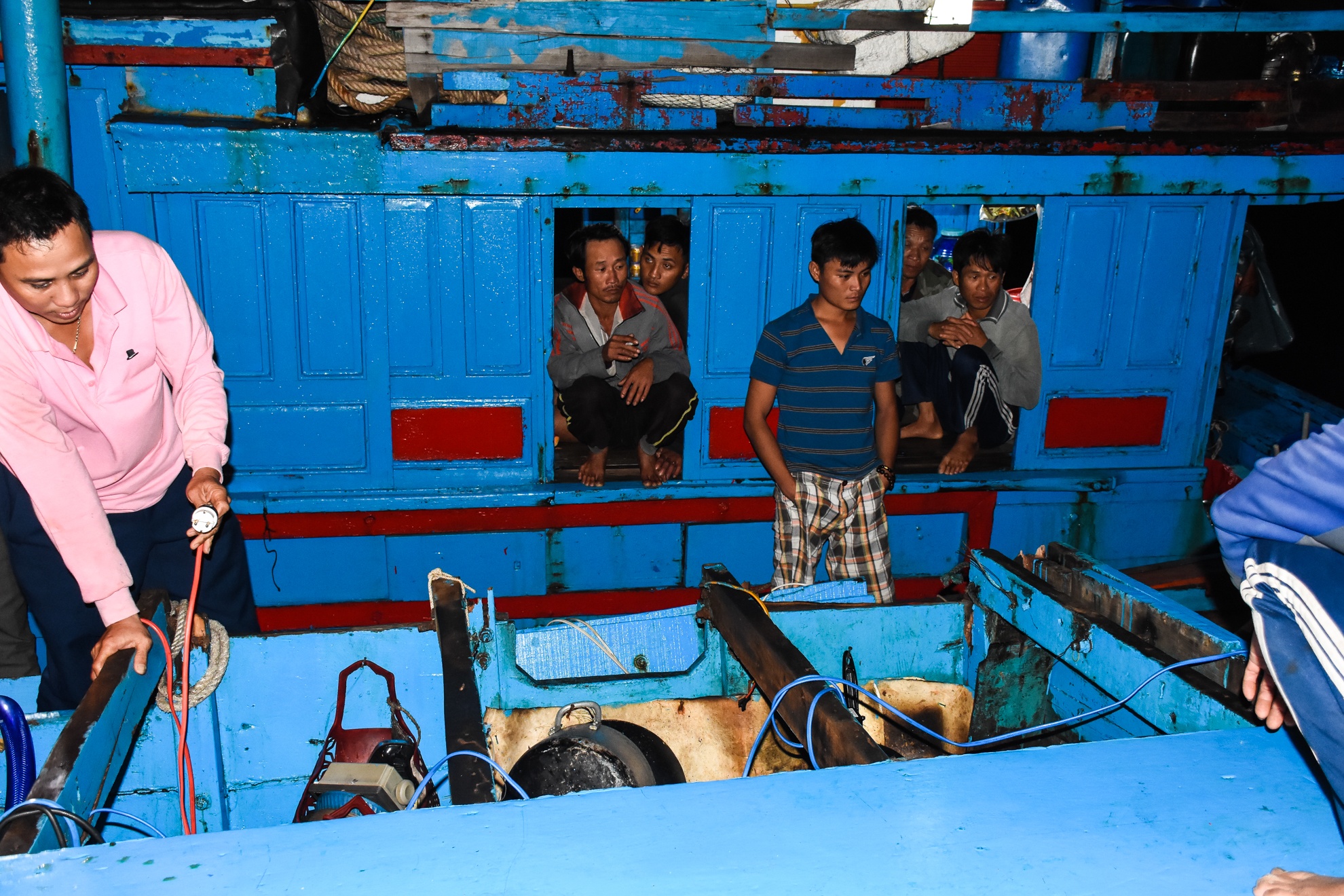 Tàu cá QNg 98459 của ông Huỳnh Văn Thạch (Đức Phổ, Quảng Ngãi) cùng 10 ngư dân đã được tàu cá đồng hương của ông Huỳnh Bi lai dắt về tới đồn biên phòng Mân Quang (Sơn Trà, Đà Nẵng).