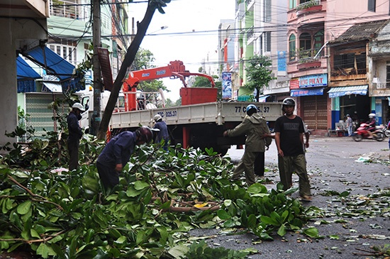 | Trên các tuyến đường Nguyễn Thị Minh Khai, Nguyễn Tất Thành, Phạm Hùng, Lê Duẩn, Nguyễn Huệ… nhiều cây xanh lớn bị gió quật ngã. Theo ông Đỗ Đình Phương, Giám đốc Công ty Công viên, Cây xanh và Chiếu sáng đô thị Quy Nhơn, thống kê bước đầu có 15 cây xanh cổ thụ (từ 15 đến 20 năm tuổi đã bị gió bão quật ngã; ngoài ra hàng loạt cây xanh nhỏ cũng ngã đổ. |