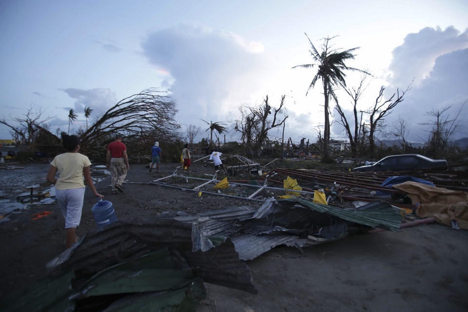 | Người dân bước qua những đống đổ nát tại thành phố Tacloban hôm 9/11. Ảnh: AP. |