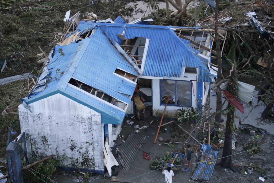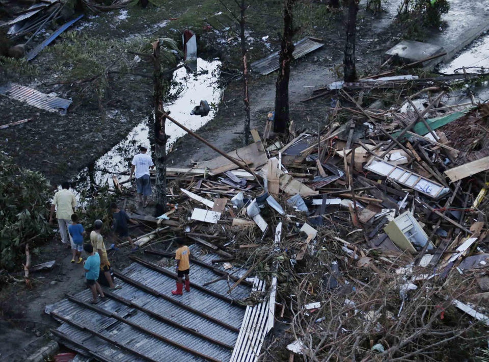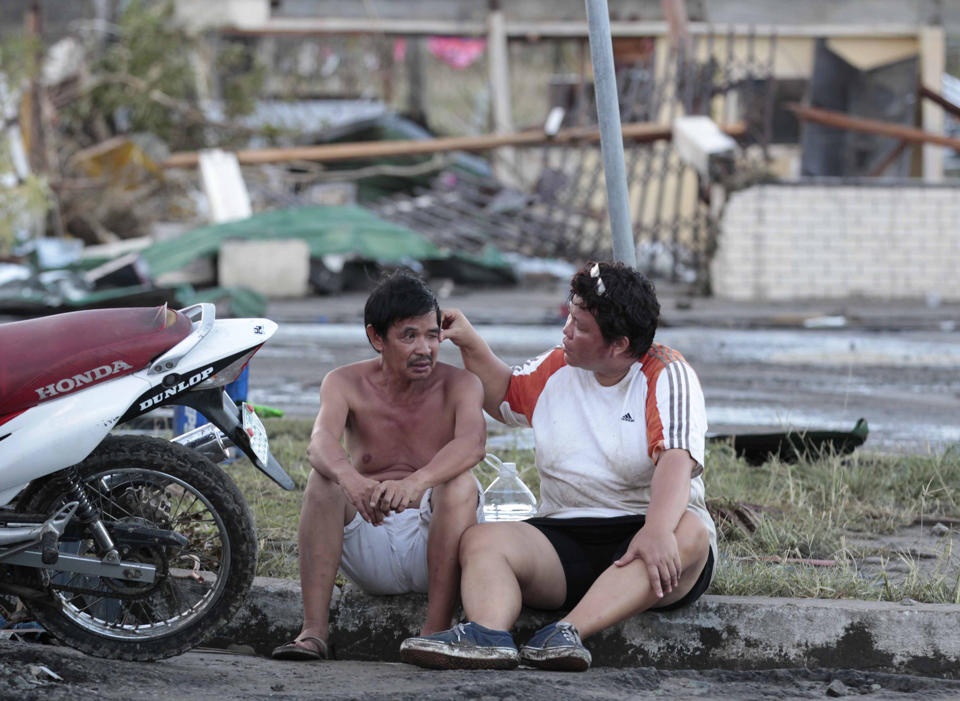 | Hai người ngồi bên ngoài ngôi nhà sập vì bão hôm 9/11. Ảnh: AP. |