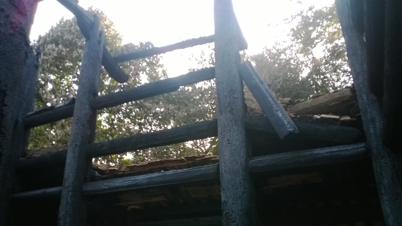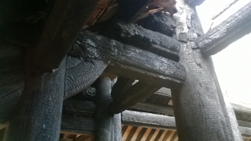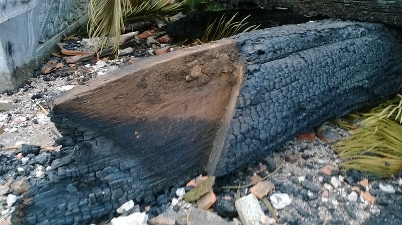 | Cận cảnh một trong rất nhiều cây cột chính bị ngọn lửa thiêu rụi thành than. |