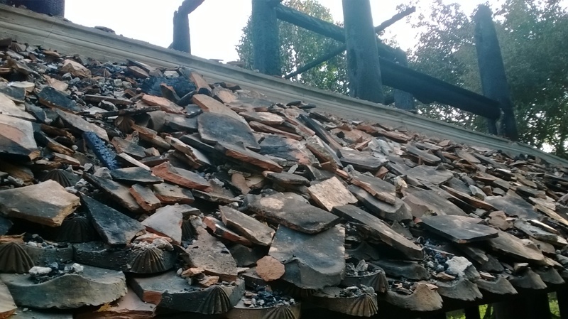 | Mái ngói bị ngọn lửa công phá đến tan hoang. |