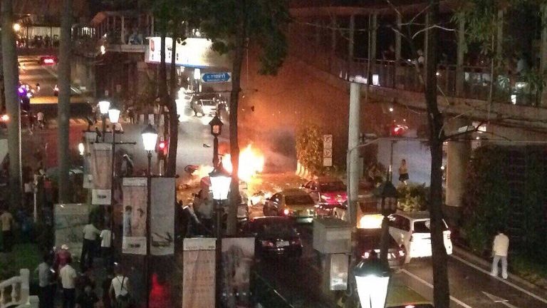 | Xe máy bốc cháy sau vụ nổ. "Tôi chỉ có thể xác nhận một vụ nổ do một xe gắn bom gây ra ở thủ đô Bangkok", Reuters dẫn lời ông Aek Angsananond, phó giám đốc cảnh sát quốc gia Thái Lan. Ảnh: geo.tv |