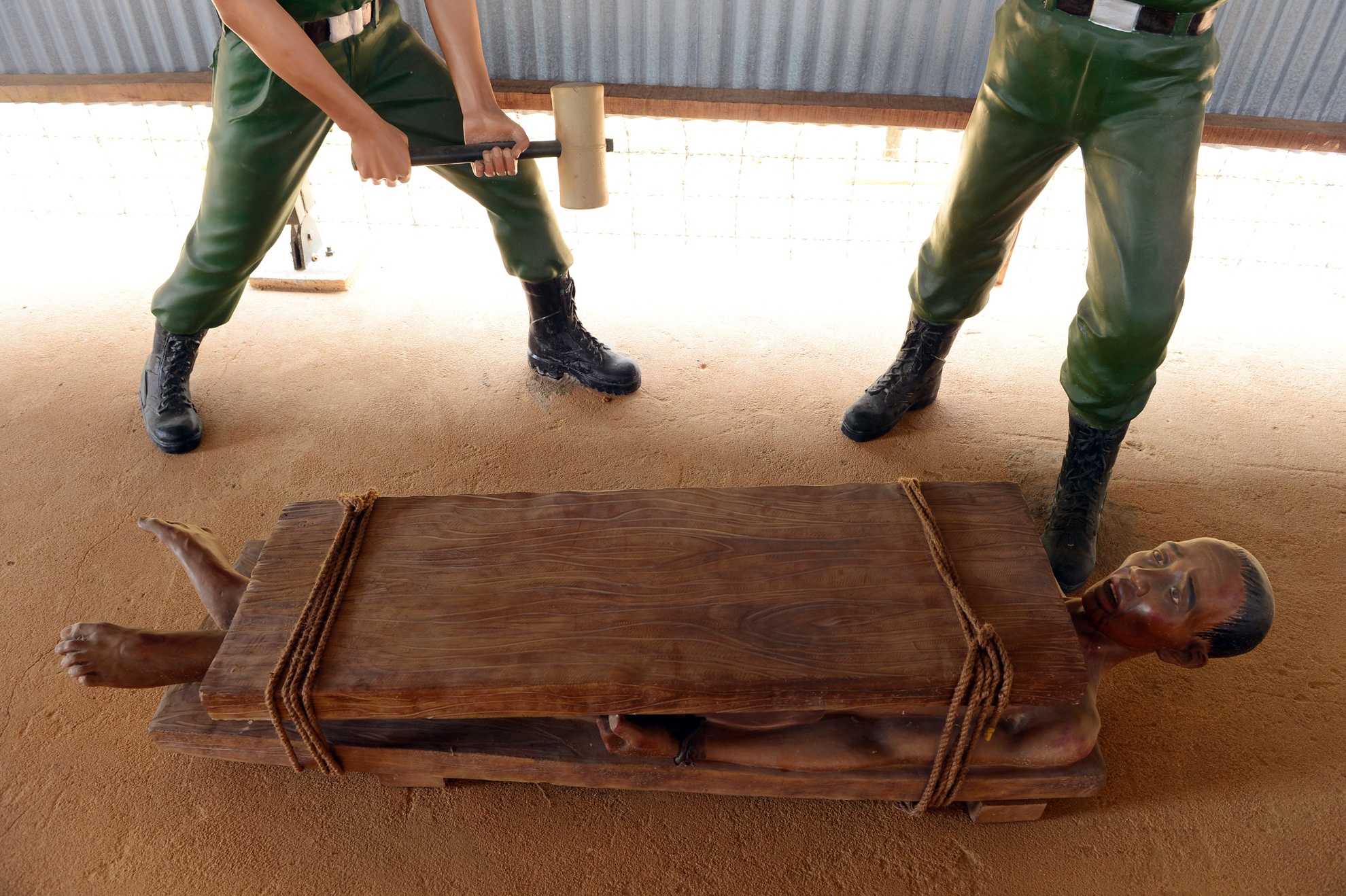 | Có tù nhân bị chúng trói, dùng ván gỗ và ốc vít để ép vào ngực hoặc ép giữa hai tấm ván dày để dùng vồ đập. |