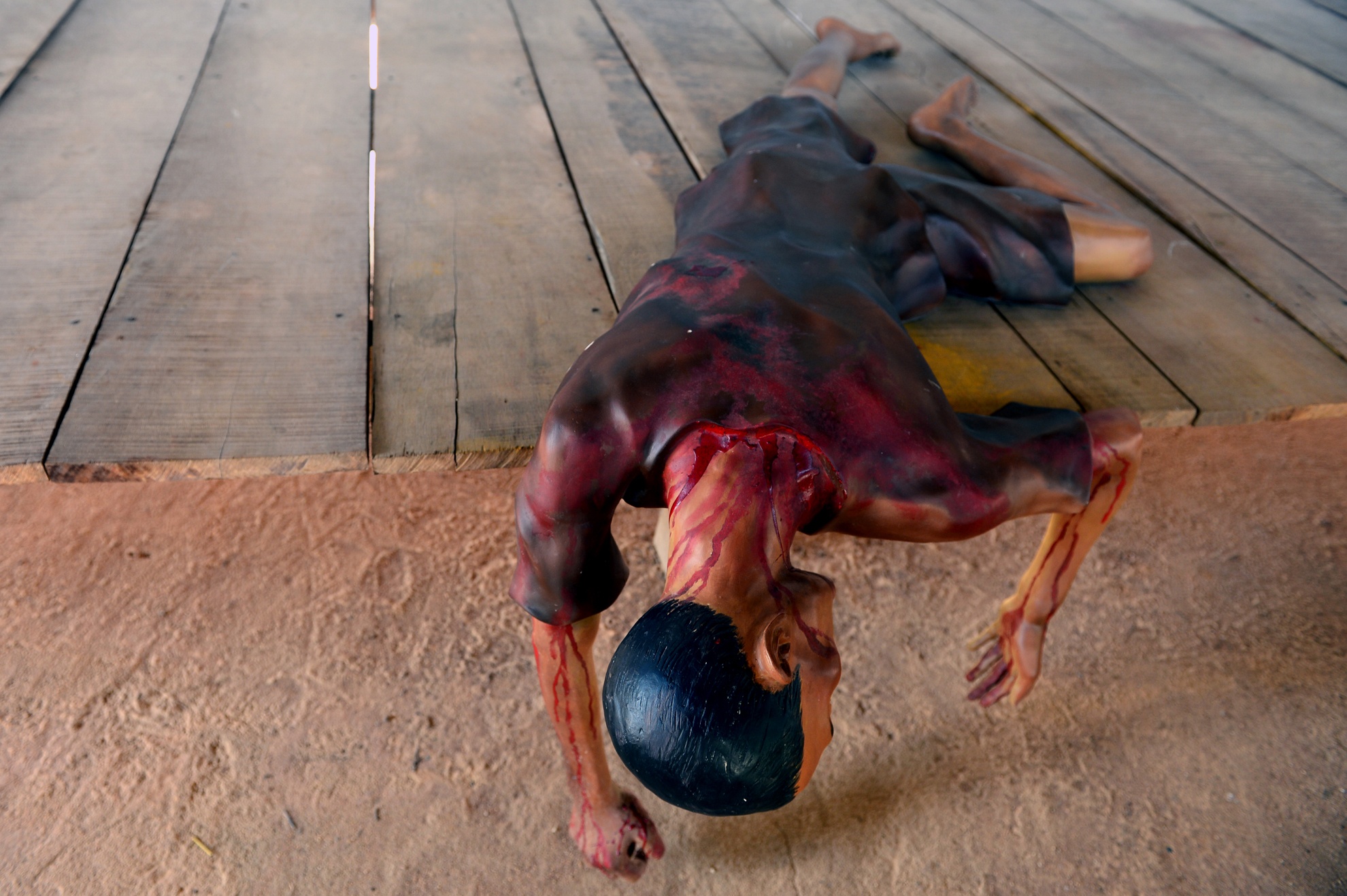 | Máu me chảy đầy người các chiến sĩ sau khi bị chúng bắt cởi trần lộn trên thanh sắt đầy sắc nhọn. |