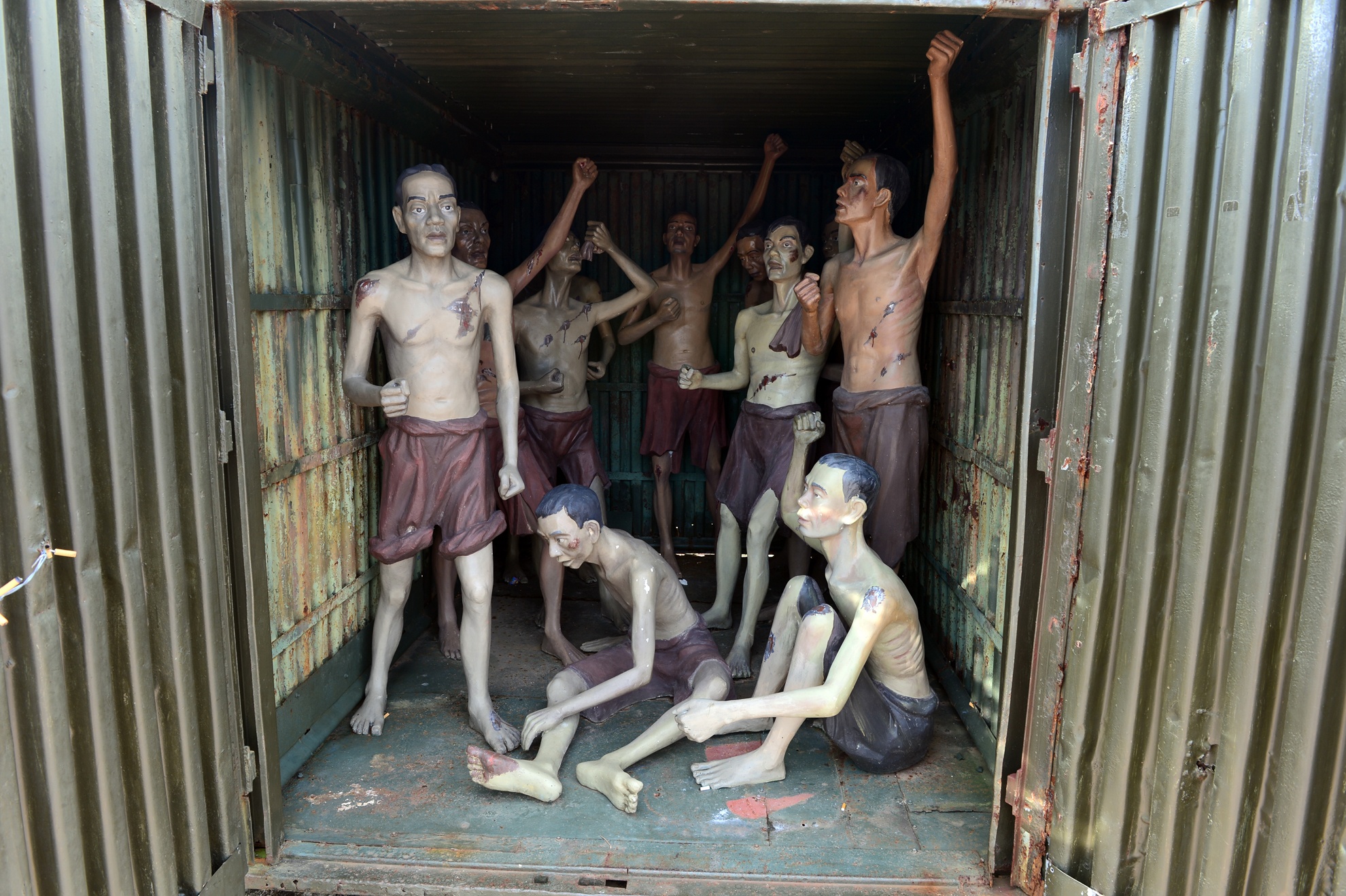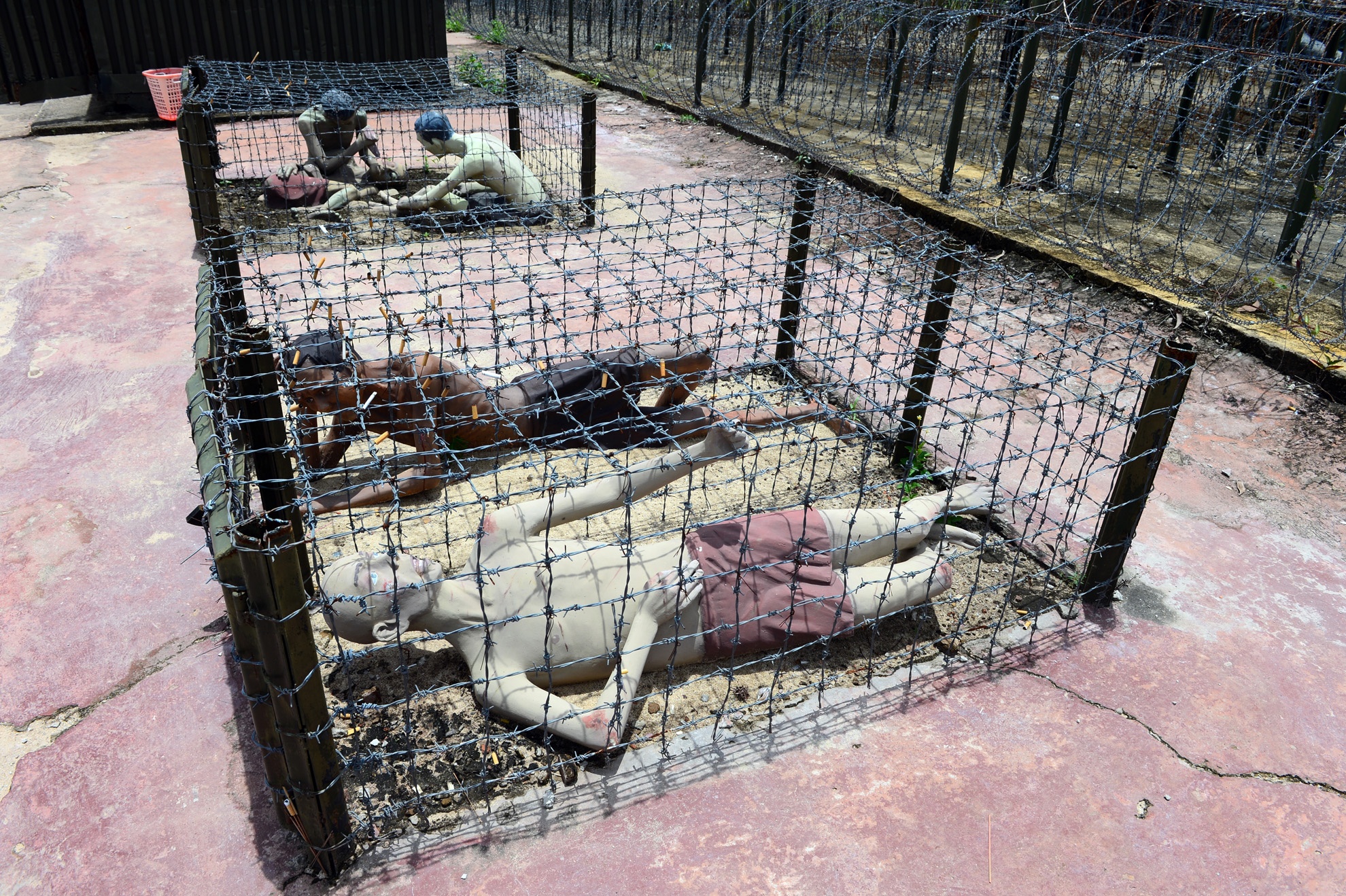 | Ở khu biệt giam diện tích chỉ dưới 30m2 nhưng khi cao điểm chúng giam tới 180 người. Các chiến sĩ cách mạng chỉ còn cách phải chia ra, nửa nằm, nửa ngồi, nằm nghiêng, co chân gác lên vai người trước, một số người thay nhau đứng lấy chỗ cho bạn tù nghỉ. |