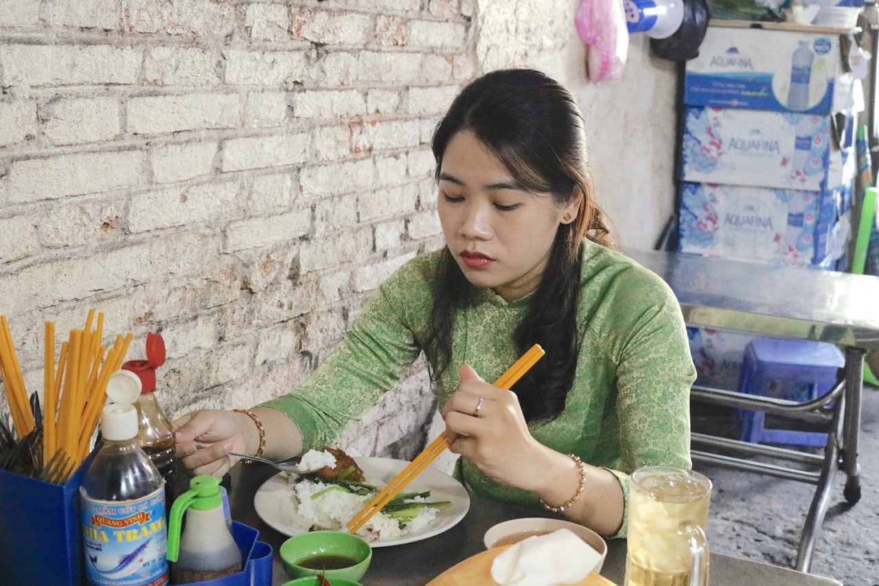 Ngày đầu trở lại cơ quan, chị Ngọc chia sẻ đã chọn bộ áo dài xanh để "hợp mệnh" với mong muốn “lấy hên”, cầu cho công việc suôn sẻ cả năm. Tranh thủ giờ nghỉ, chị ghé qua quán quen để thưởng thức món cơm gà yêu thích.