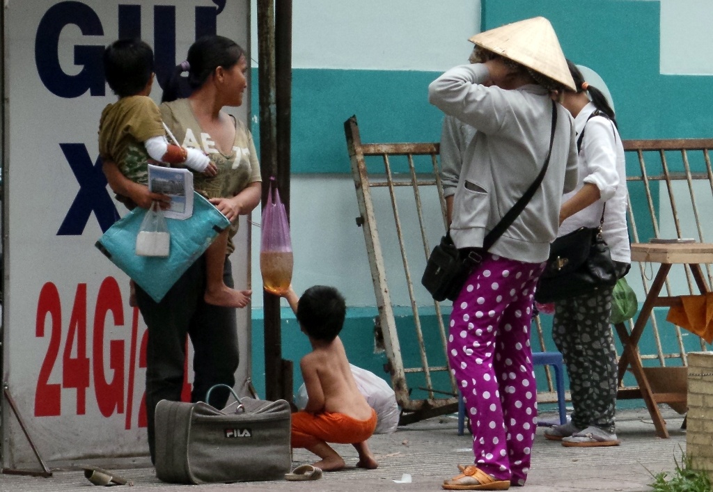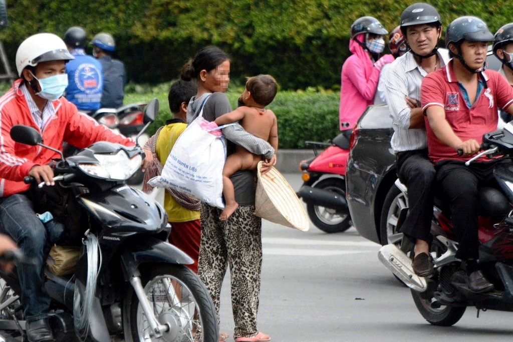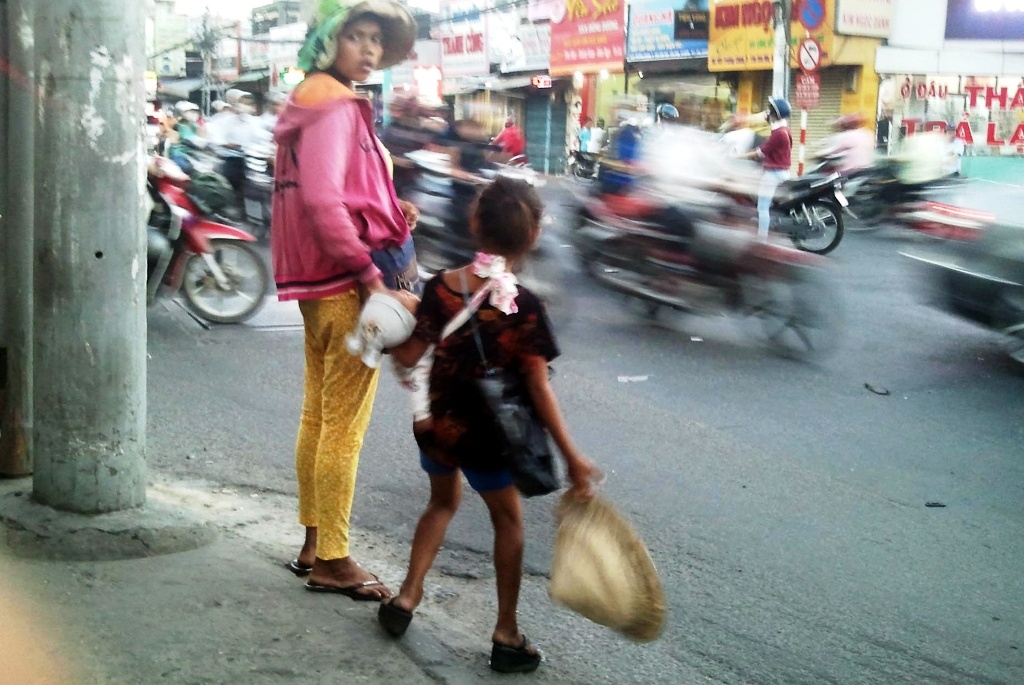 | Mỗi nhóm ăn xin thường có một phụ nữ, một trẻ em vài tuổi và một bé sơ sinh chỉ vài tháng tuổi. Người phụ nữ có nhiệm vụ ẵm bé sơ sinh ngồi giữa nắng mưa và kiểm soát bé lớn. Đứa trẻ mới vài tuổi này phải trực tiếp ra đường, len lỏi vào dòng xe cộ đông đúc ở các giao lộ xin tiền về "cống nộp". |