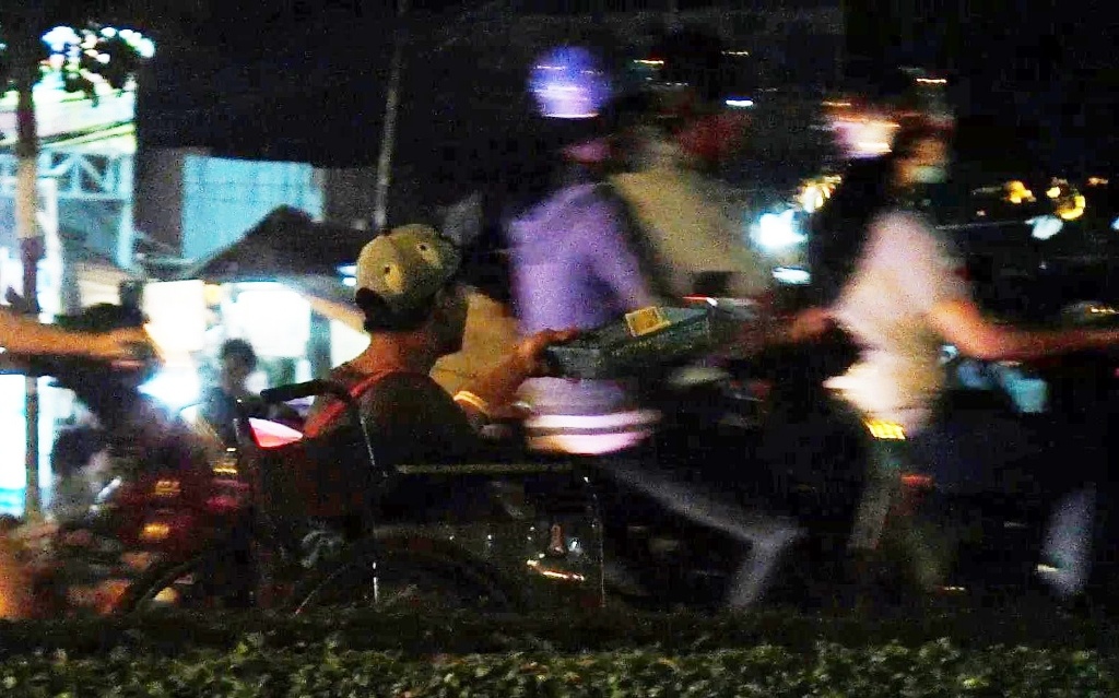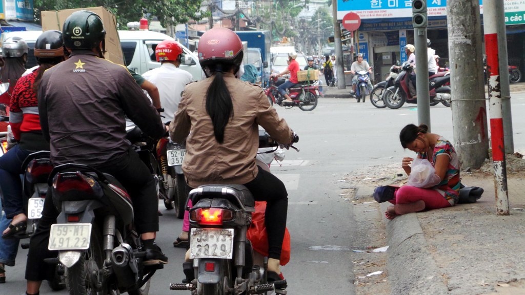| Một thanh niên khoảng 25 tuổi, bị tàn tật ăn xin tại giao lộ Nguyễn Văn Linh - đường dẫn cầu Tân Thuận. Không ngồi một chỗ như những người khác, người thanh niên này cho xe chạy tới chạy lui, len lỏi vào cả dòng xe cộ lưu thông tại đây để xin tiền. Khi xin được nhiều, anh ta sẽ gom lại đưa cho một người đàn ông ngồi gần đó, chỉ để lại vài ngàn đồng tiền lẻ. Người thanh niên cùng người đàn ông kia hoạt động tại khu vực này từ chiều tối đến khuya mỗi ngày và kiếm được khá nhiều tiền. |