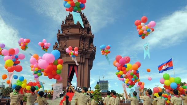 Sinh viên Campuchia thả bóng gần tượng đài độc lập ở thủ đô Phnom Penh. Tượng đài này được xây dựng để đánh dấu mốc quan trọng của đất nước khi Campuchia thoát khỏi ách thống trị của thực dân Pháp ngày 9/11/1953. Ảnh: BBC.