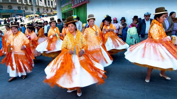 Phụ nữ Bolivia nhảy múa mừng ngày độc lập trên đường phố thủ đô La Paz. Người dân quốc gia Nam Mỹ này hàng năm tưng bừng kỷ niệm quốc khánh vào ngày 6/8 và 7/8. Ảnh: BBC.