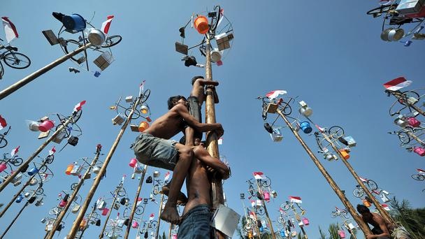 Người dân Indonesia chơi trò leo cột để giành phần thưởng treo trên đỉnh cột dịp quốc khánh. Người dân quốc gia Đông Nam Á này mừng ngày độc lập vào 17/8 hàng năm. Ảnh: BBC.