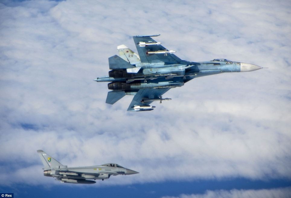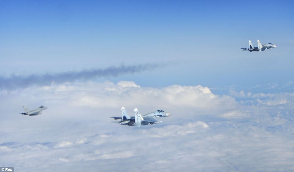 | Một phi cơ Typhoon của Anh bay ở phía bên trái hai chiến đấu cơ SU-27 Flanker của Nga. |
