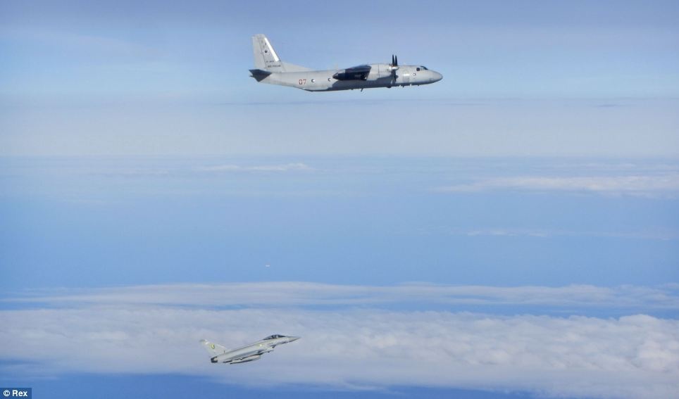 | Chiếc Typhoon (dưới) bám theo phi cơ vận tải Antonov An26 Curl (trên). |