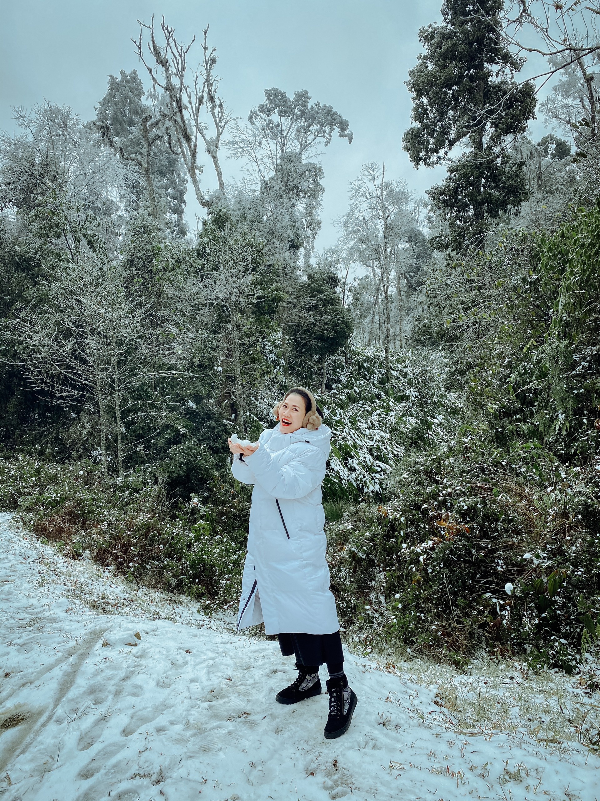 Hồng Trang cho biết bản thân mình may mắn khi 4 lần săn tuyết đều thành công: "Đợt này, tuyết không quá dày bằng năm 2013-2014 nhưng cũng đủ tạo khung cảnh hệt trời Tây. Mình thường đi cùng nhóm bạn thân thiết đến Sa Pa, Y Tý, mang sẵn máy móc ghi lại ảnh đẹp ở đây". |