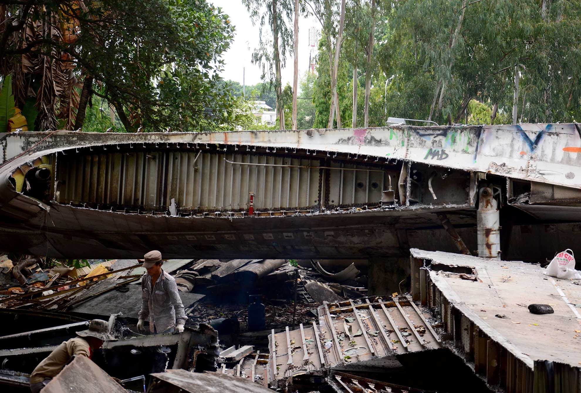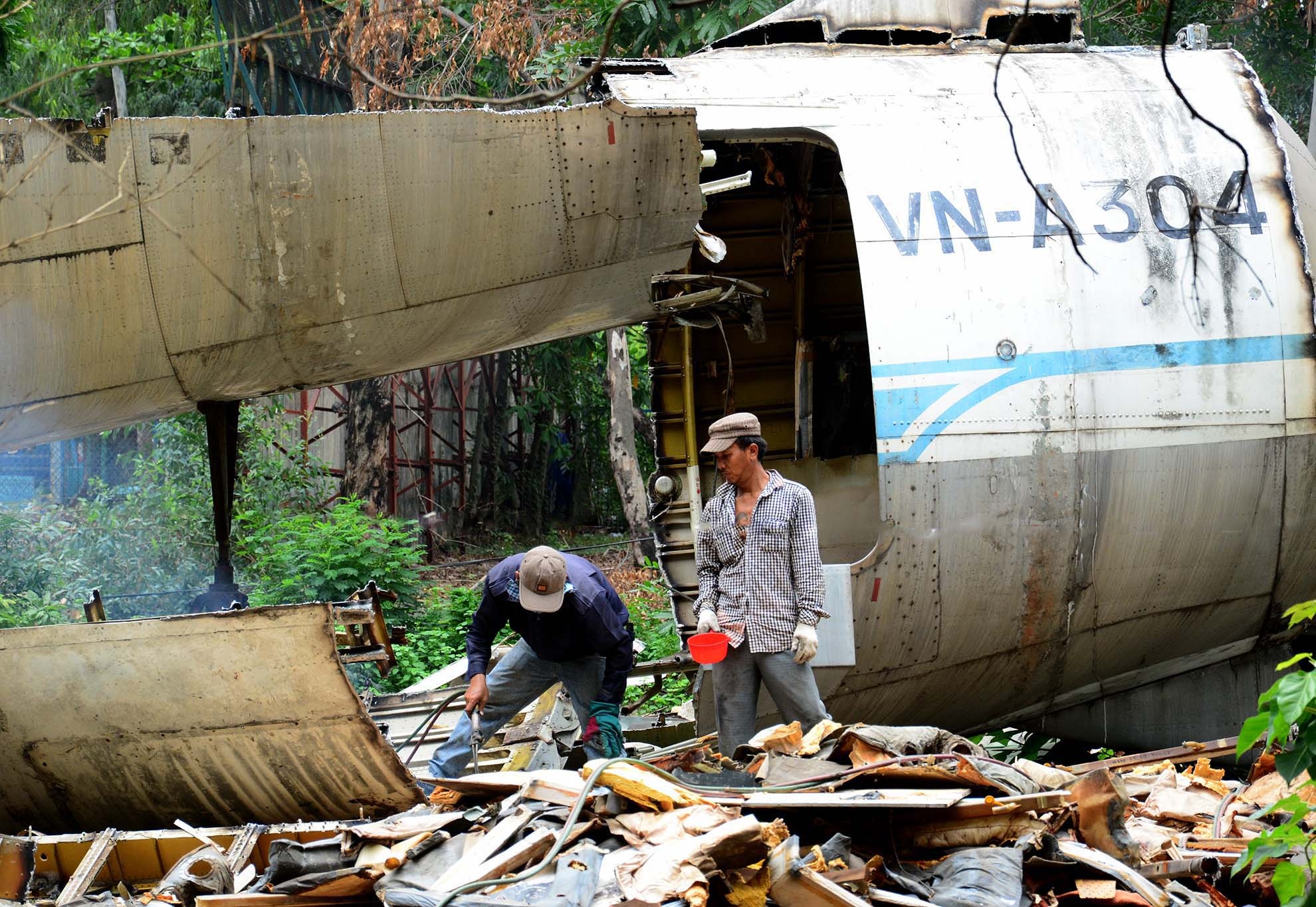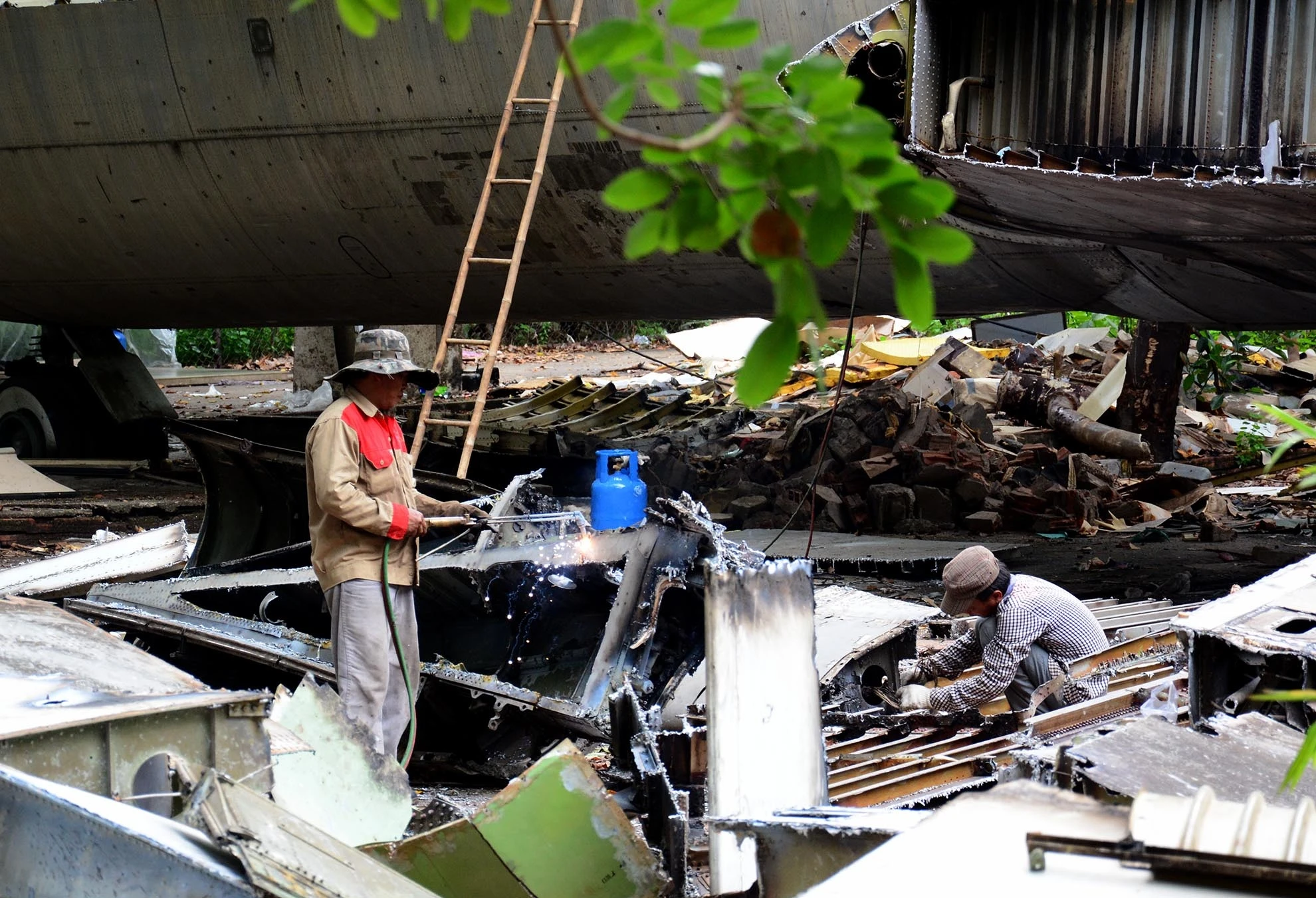 Sau 1 tuần thi công, hơn 1/2 chiếc Boeing 707 tại bãi đất trống gần sân bay Tân Sơn Nhất (TP HCM) đã được "hóa kiếp", các mảnh nhôm sắt nằm ngổn ngang ở công trường.