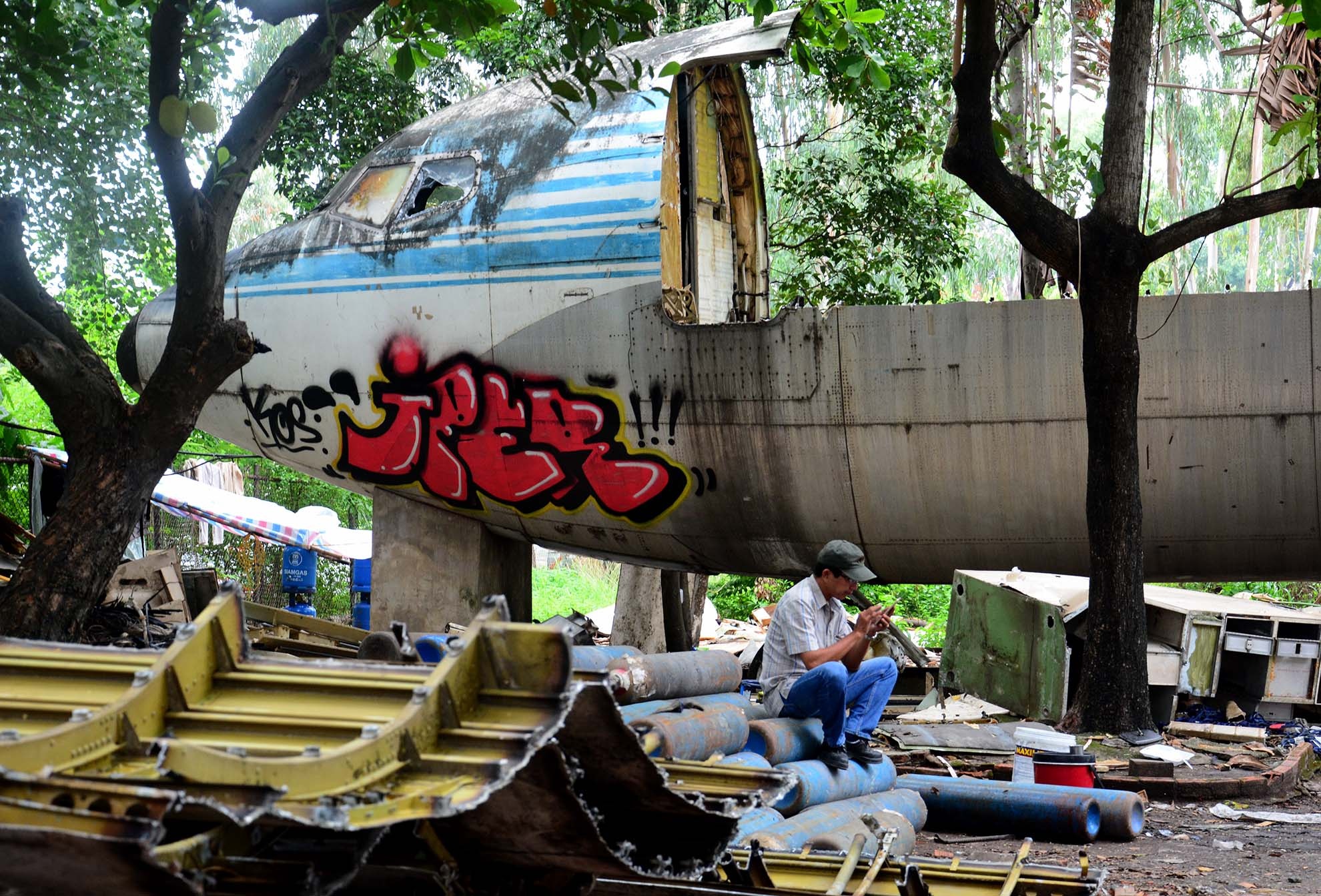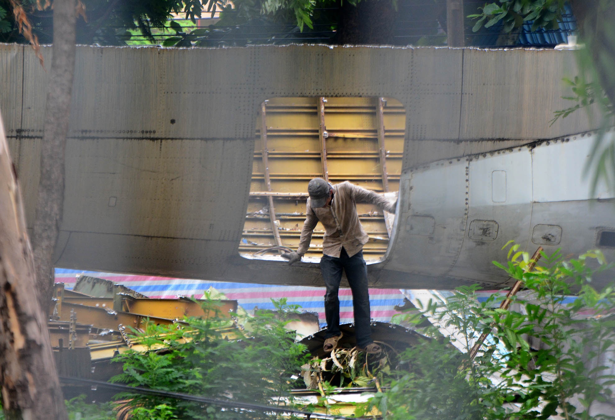 | Một công nhân ngồi trong bụng máy bay cắt từng mảng thân 2 bên. |