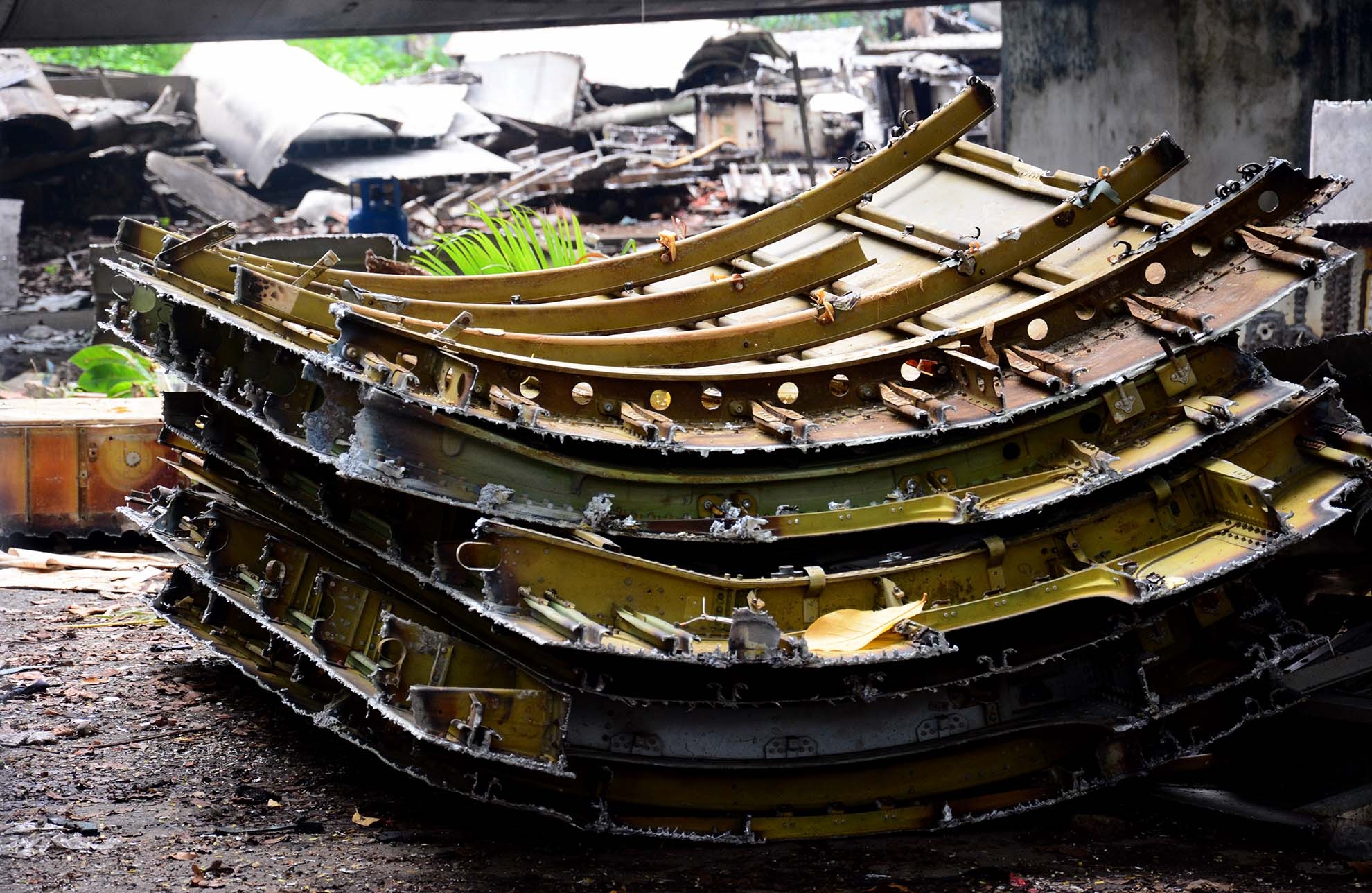 | Các tấm thép, nhôm phần vỏ và thân được cắt nhỏ thành những tấm hình vuông 1,5 x 1,5 m, tập kết lại một chỗ. |