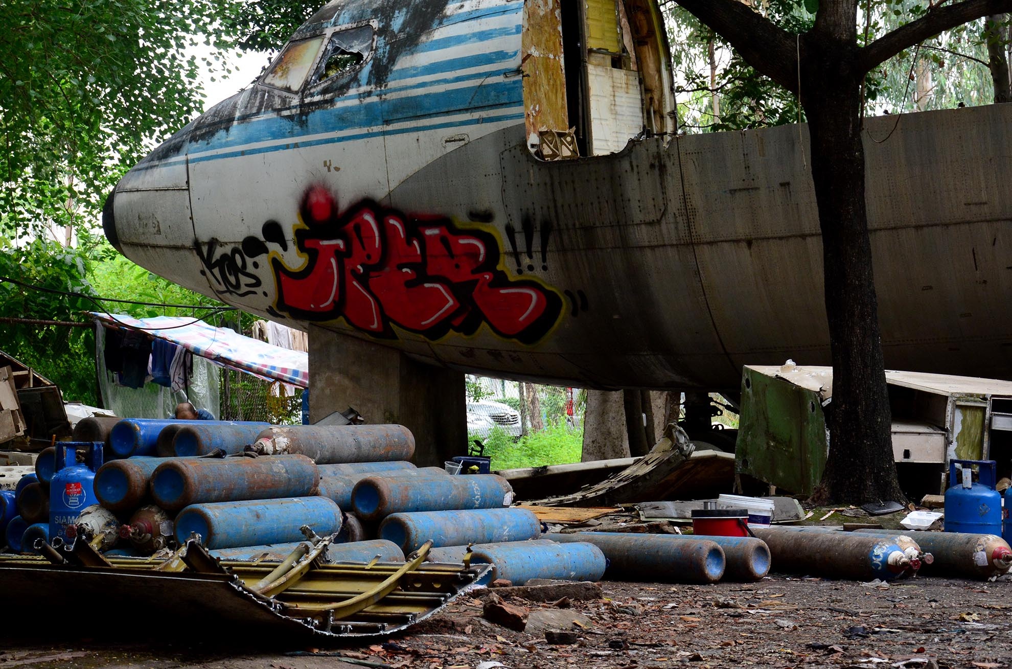 | Để cắt toàn bộ chiếc Boeing 707, đơn vị thi công phải dùng nhiều bình gió đá lớn để chạy máy hàn xì. |