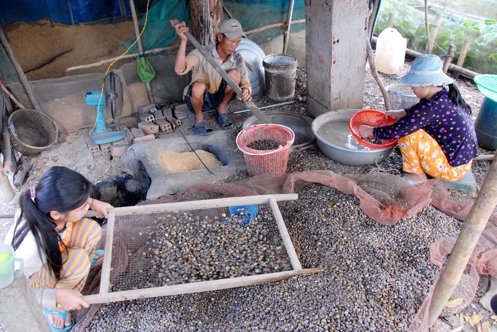 | Các thành viên trong gia đình đều tham gia sơ chế hến vừa cào về từ sông, kênh. Công đoạn đầu tiên là sàng để loại bỏ sỏi, các vật thể cứng. |