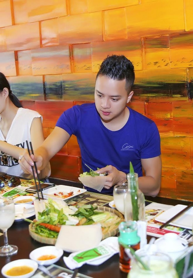 | Anh rất ga- lăng khi cẩn thận cuốn bánh, chăm sóc tỉ mỉ cho Lê Hà xuyên suốt buổi ăn uống. |