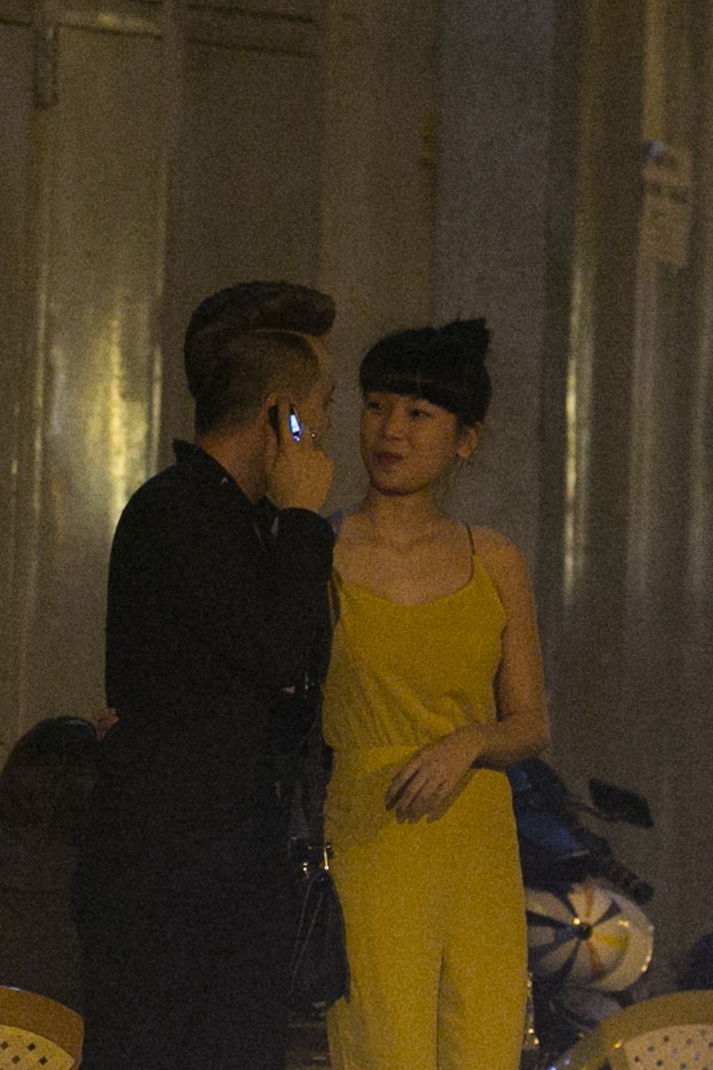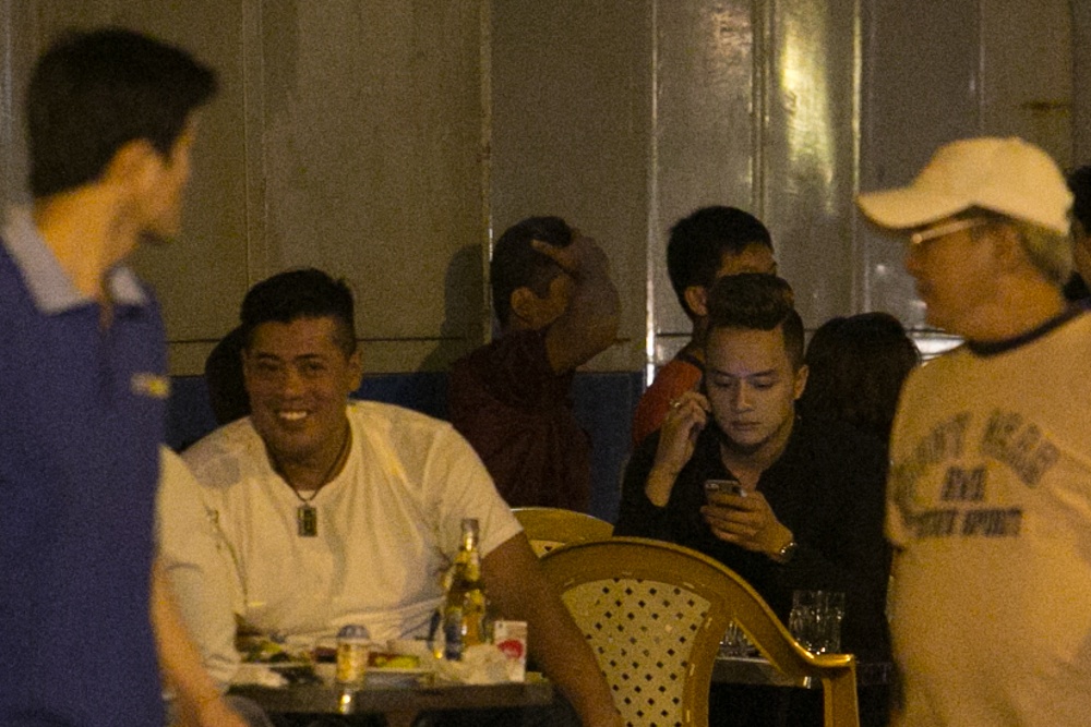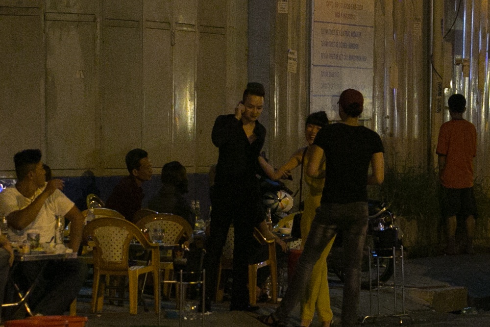 Vẫn bận rộn với điện thoại nhưng anh chàng không quên những cử chỉ tay bắt mặt mừng cùng cô gái vừa có mặt ở quán ăn đêm ven đường.