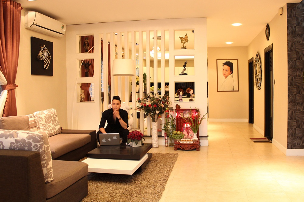 | Phòng khách rộng với ánh sáng vàng, tạo sự ấm cúng cho căn nhà. Khác với mọi năm, Cao Thái Sơn thường đi diễn hoặc về Hà Nội đón Tết cùng gia đình, tuy nhiên, năm nay, anh ở lại Sài Gòn đón Tết đầu tiên trong căn nhà mới. |