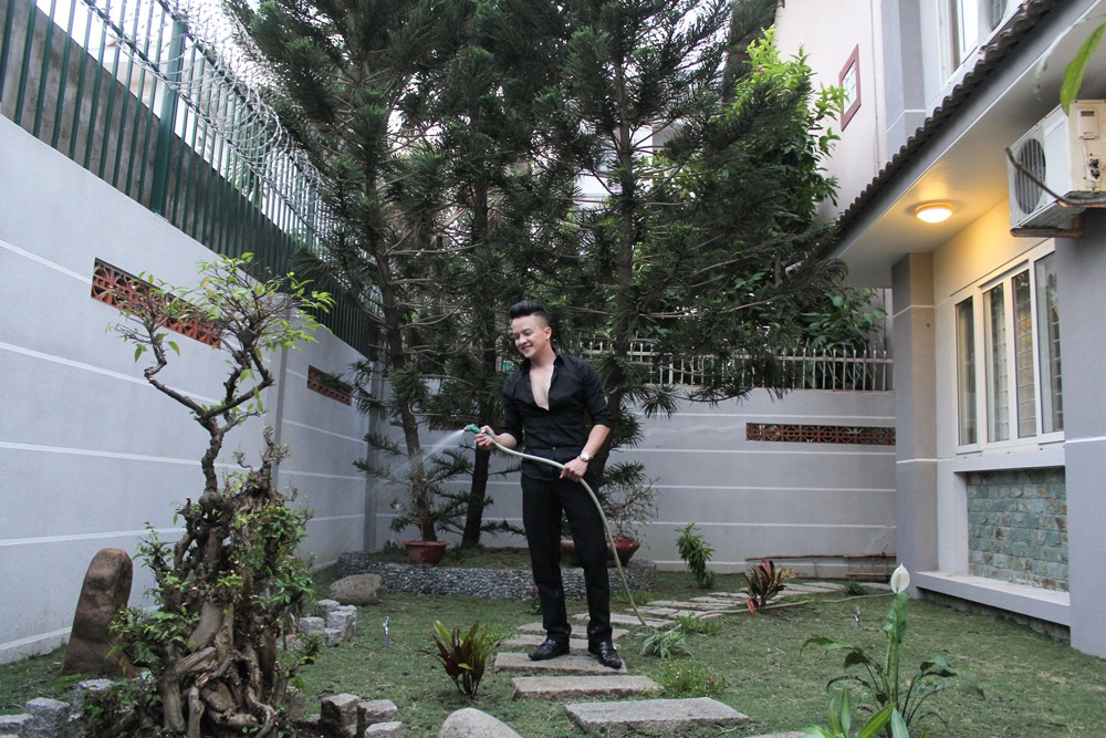 Lối đi quanh nhà được lót đá, xung quanh trồng nhiều cây. Nam ca sĩ chia sẻ, không gian thoáng mát của khuôn viên quanh nhà giúp anh thư giãn tinh thần sau những chuyến lưu diễn mệt mỏi.