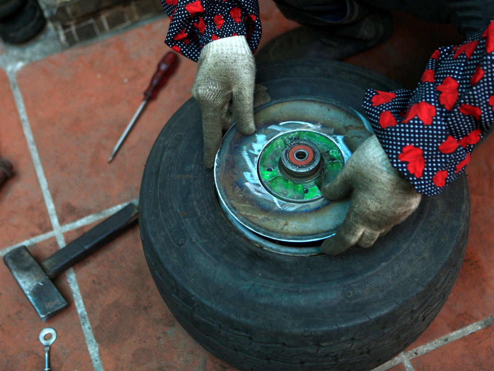 | Dũng "bưởi" cho biết, anh thường tự chế hoặc đi đặt hàng từng thiết bị theo mẫu mã thiết kế riêng, hoặc tận dụng linh kiện từ những loại xe khác. Trong ảnh là một chiếc lốp của xe nâng hàng được chế lại để lắp vào moay-ơ của xe Chaly. |