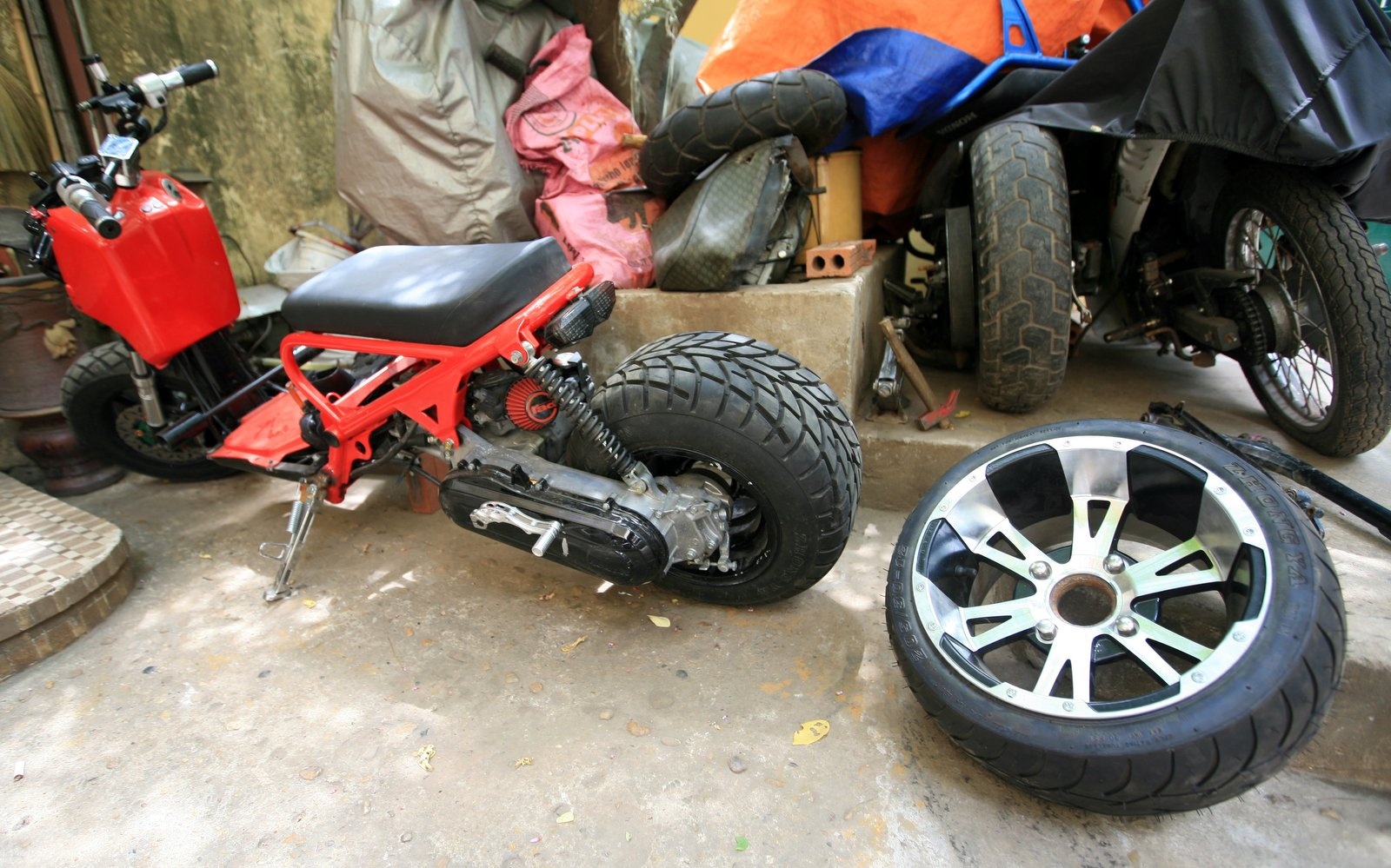 | Trong xưởng đang có chiếc Honda Zoomer được độ lại vành lốp và ghi đông. |