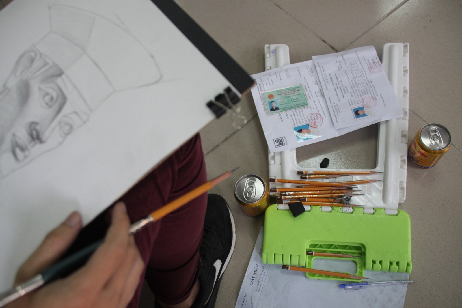 | Để hoàn thành tốt bài thi, các thí sinh đều mang đủ dụng cụ cần thiết như ghế nhựa, các loại bút chì 2b, 3b, 4b; tẩy, gọt bút chì, dao dọc giấy, bảng vẽ... Một số thí sinh mang theo các loại nước uống để đảm bảo đủ sức lực, tỉnh tảo trong suốt 3 tiếng ngồi vẽ. |