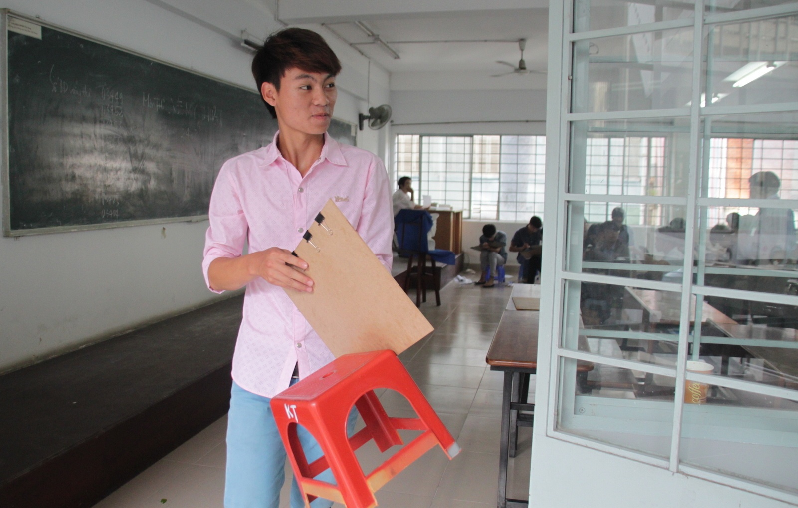 | Không có nhiều thí sinh hoàn thành sớm bài thi. Trong ảnh, sĩ tử Nguyễn Thiện Quang (quê Lâm Đồng) là một trong số ít thí sinh làm xong bài thi sớm. Điểm các môn thi khối V1 sẽ lấy hệ số 1. |