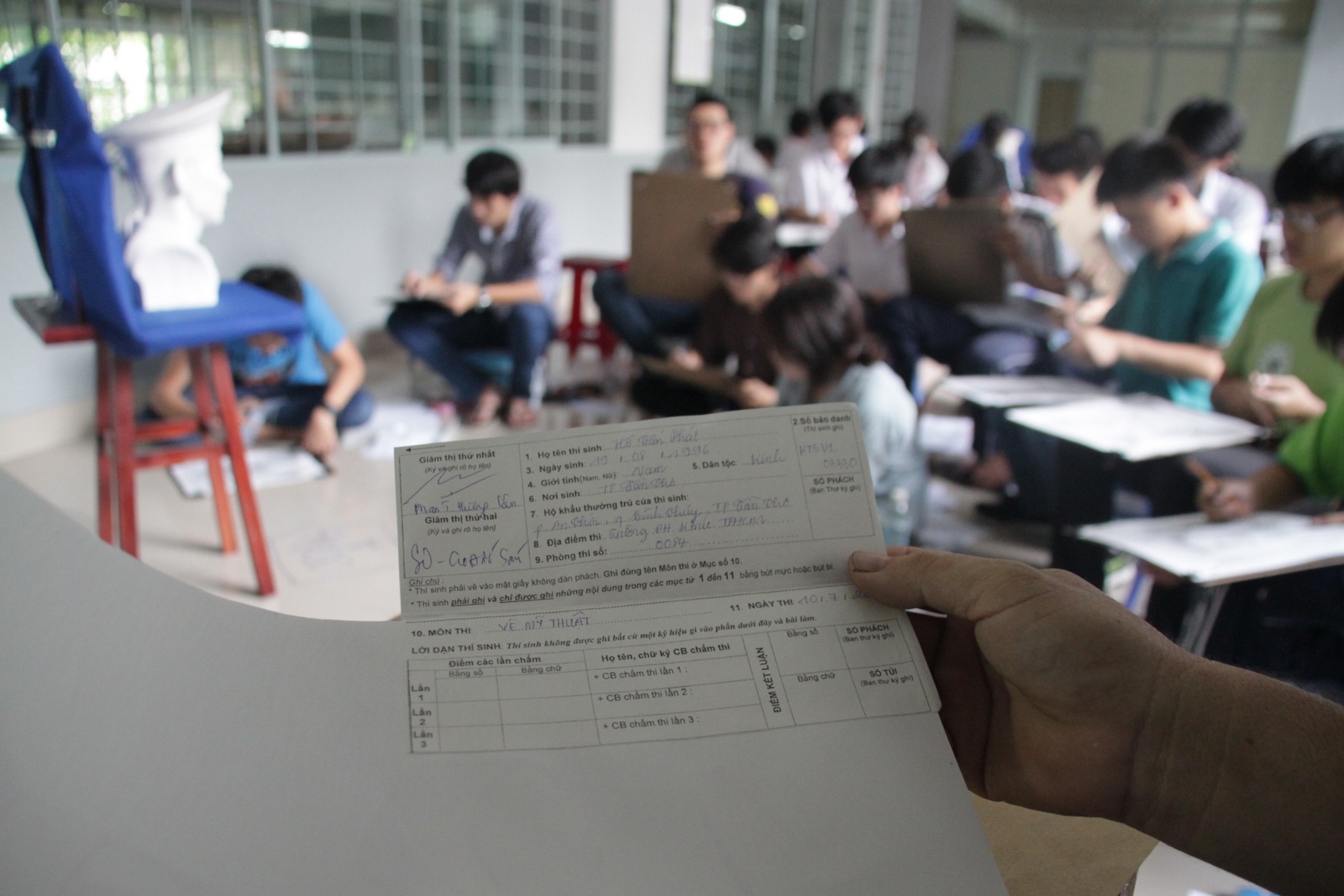 | Không như nhiều bài thi khác, với phần thi vẽ thì thí sinh được phát 1 mảnh giấy riêng để điền thông tin. Mảnh giấy được dán vào bài làm. |