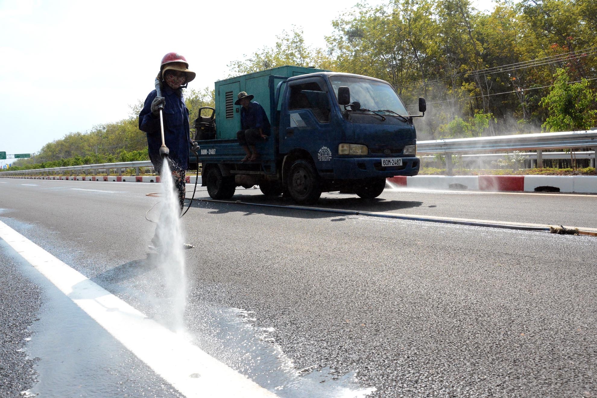 | Công nhân dùng nước rửa sạch dải phân cách, vạch phân làn bị dính bẩn trong quá trình thi công để đảm bảo tuyến đường được sạch sẽ trước ngày thông xe toàn bộ 55 km từ TP HCM - Đồng Nai. |