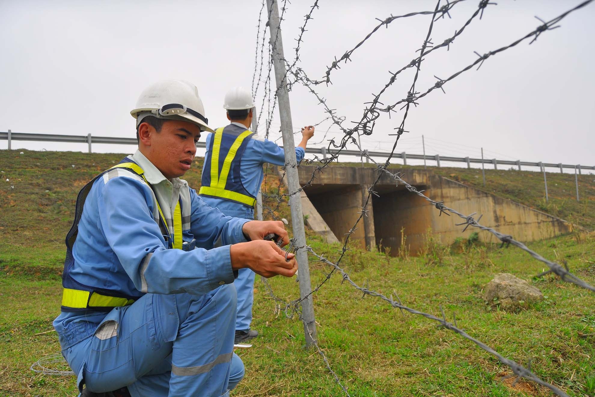 | Nhân viên tuần đường Trung tâm điều hành cao tốc Nội Bài - Lào Cai lắp lại điểm rào lưới bị phá hàng chục mét tại km 36. Ảnh: Hoàn Nguyễn. |