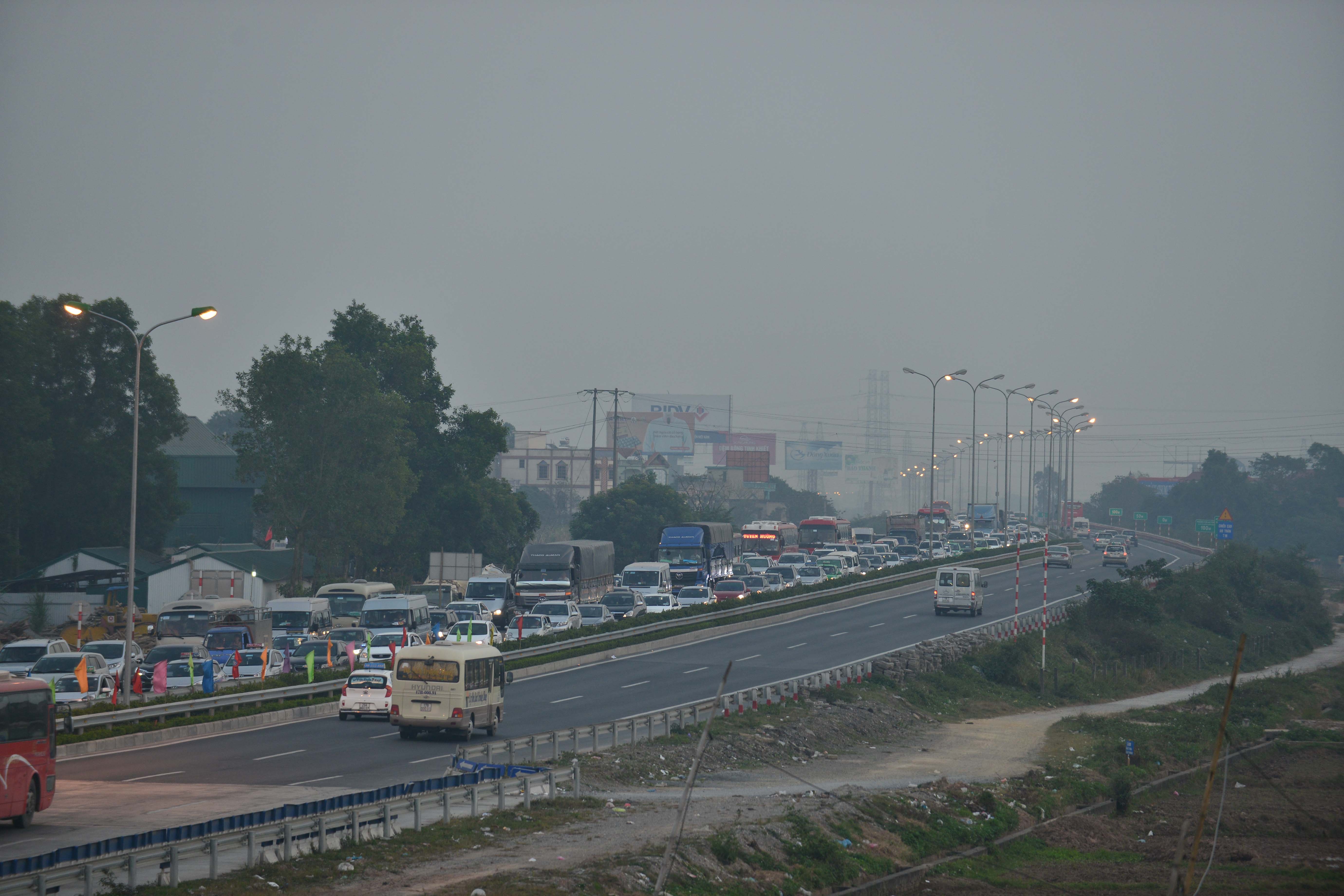 | Xe cộ chen chúc xếp hàng dài trên cao tốc Pháp Vân - Cầu Giẽ hướng về Hà Nội, trong khi hướng ngược lại thông thoáng. |