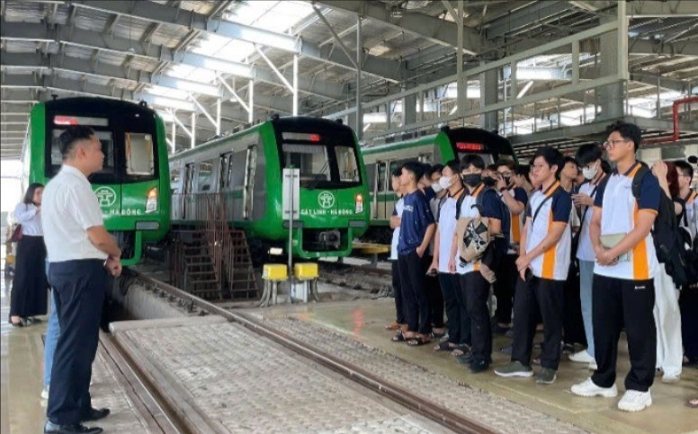 Sinh viên chuyên ngành Đường sắt và Metro tham quan học tập tại tuyến đường sắt đô thị Cát Linh - Hà Đông. Ảnh: UTT. |
