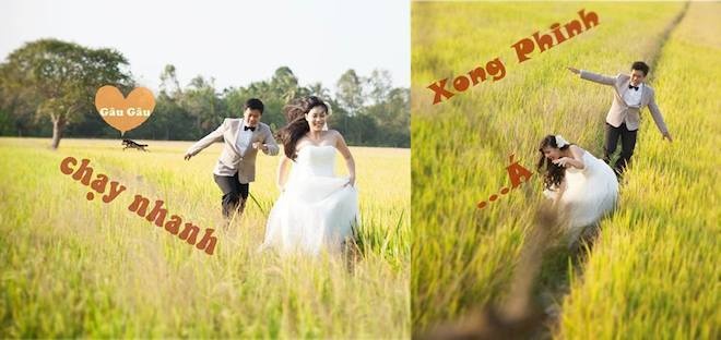 Phúc - Trang cho hay, kỷ niệm đáng nhớ nhất là khi chụp ở đồng ruộng lúa - "Bờ ruộng thì nhỏ, lại không bằng phẳng, bọn mình cứ chạy tới chạy lui, tụt hố không biết bao nhiêu lần. Cô dâu chú rể về nhà y như là bị chó rượt té ruộng, quần áo toàn bùn là bùn".