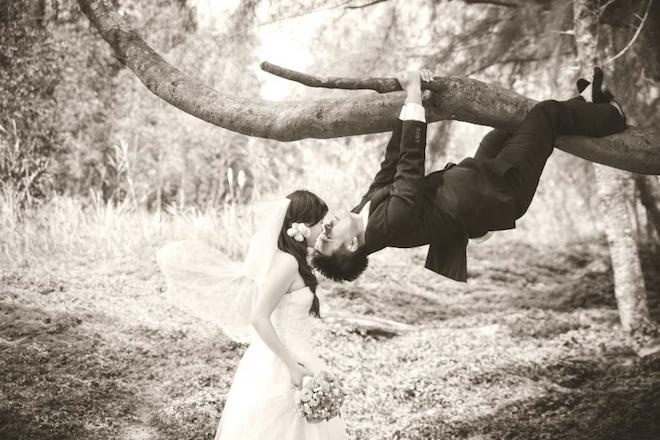 Xuất phát từ tính cách hài hước, cặp đôi trẻ tuổi đã mang đến bộ ảnh cưới với cảnh trèo cây, ngã nhào trên đồng ruộng, tung chưởng.