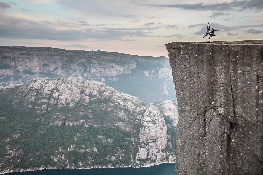 Cặp đôi trên một mỏm núi đá ở Na Uy . |