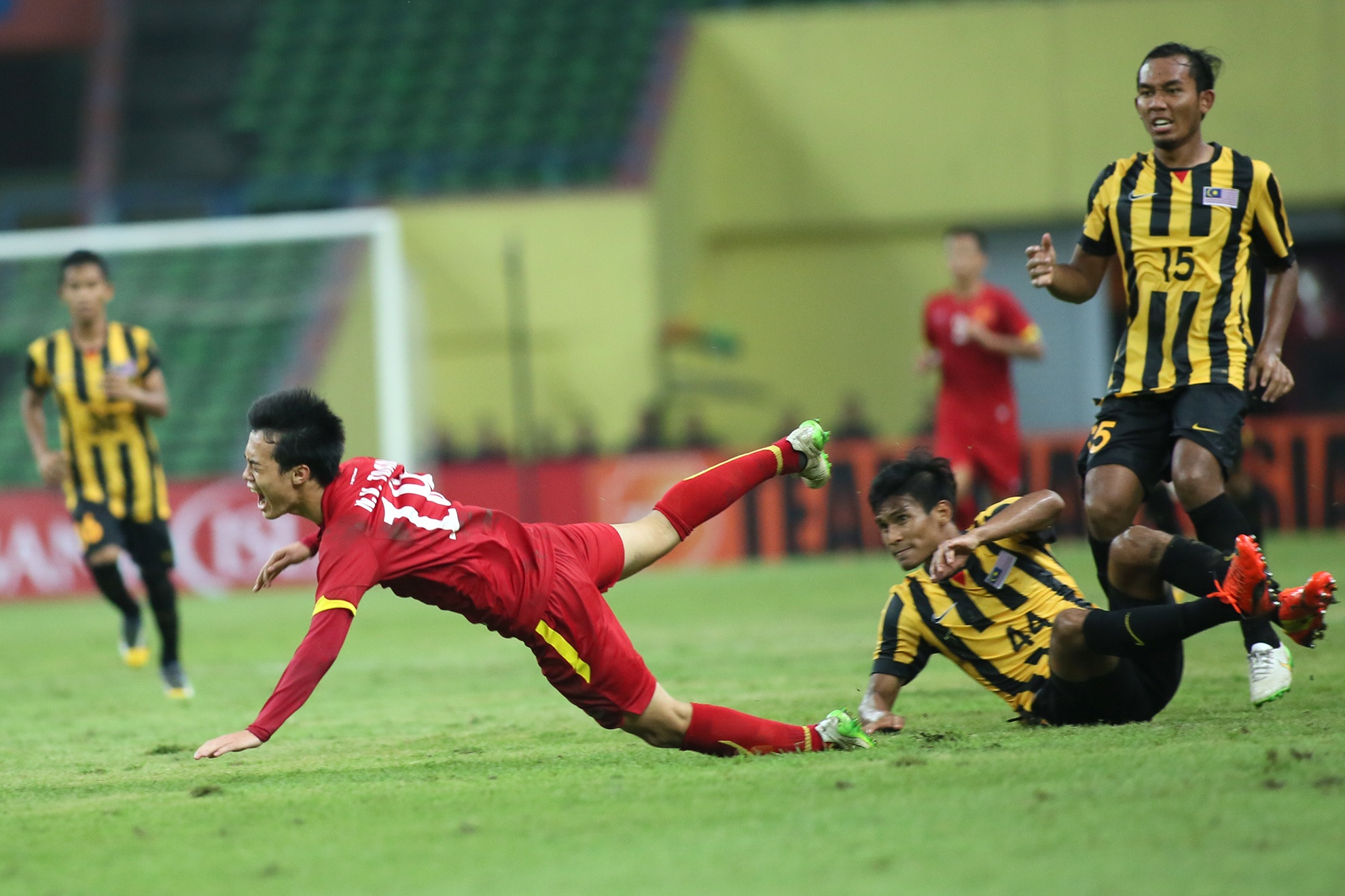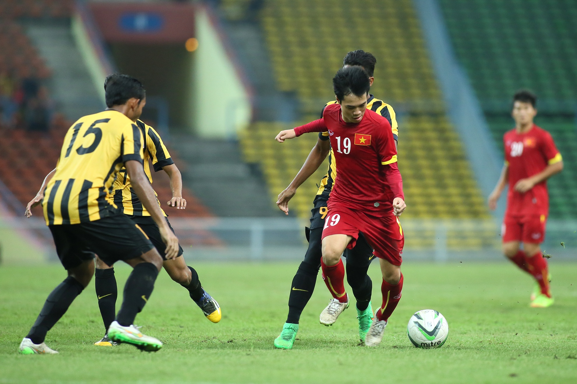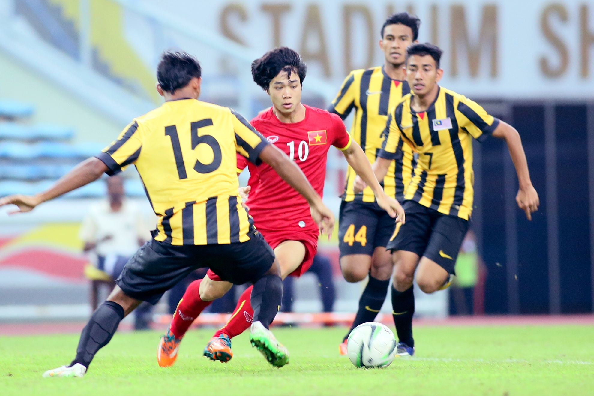 | Công Phượng luôn bị từ 3 đến 4 cầu thủ Malaysia áp sát khi có bóng. |