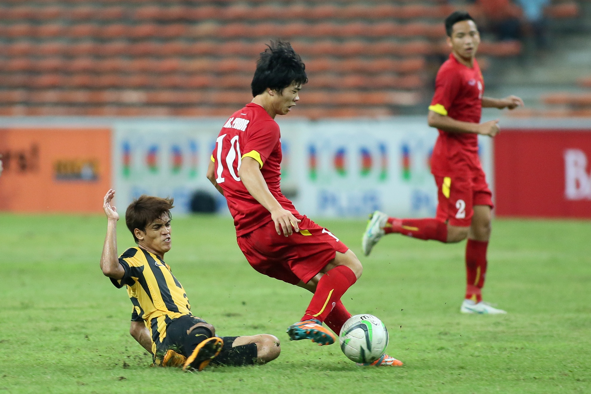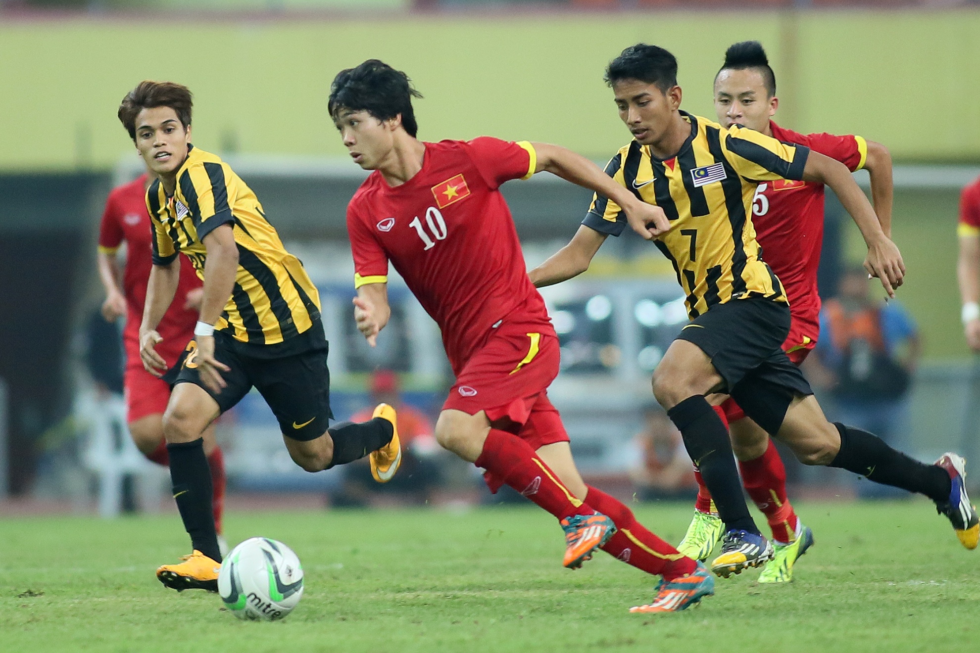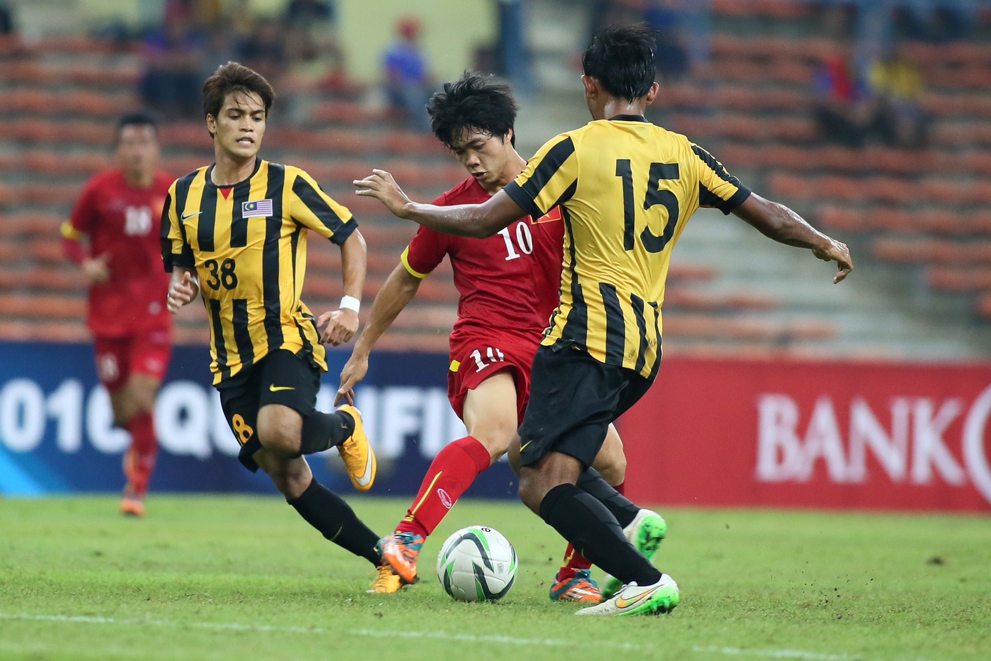 | Công Phượng luôn bị từ 3 đến 4 cầu thủ Malaysia áp sát khi có bóng. |