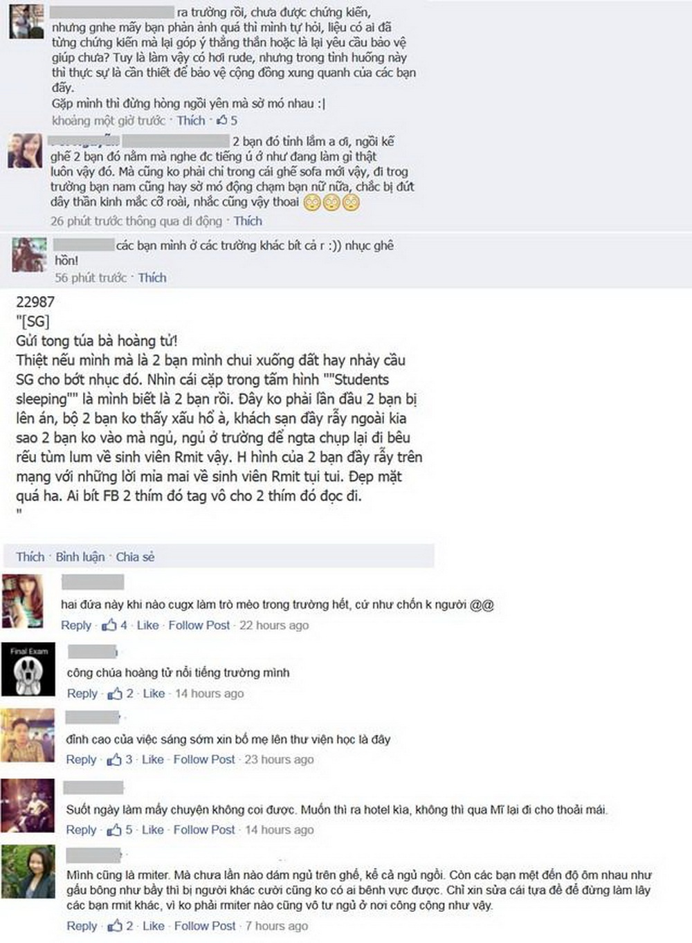 Những hình ảnh này sau khi được đăng tải đã tạo nên những luồng ý kiến chỉ trích mạnh mẽ từ cộng đồng mạng: "Đây là trường học chứ có phải nhà nghỉ đâu mà các bạn có thể vô tư ôm nhau nằm ngủ một cách thoải mái như vậy. Các bạn phải biết lịch sự, giữ ý với những bạn sinh viên khác nữa chứ. Ngán ngẩm với các hành xử của bạn trẻ thời nay", một dân mạng bình luận.