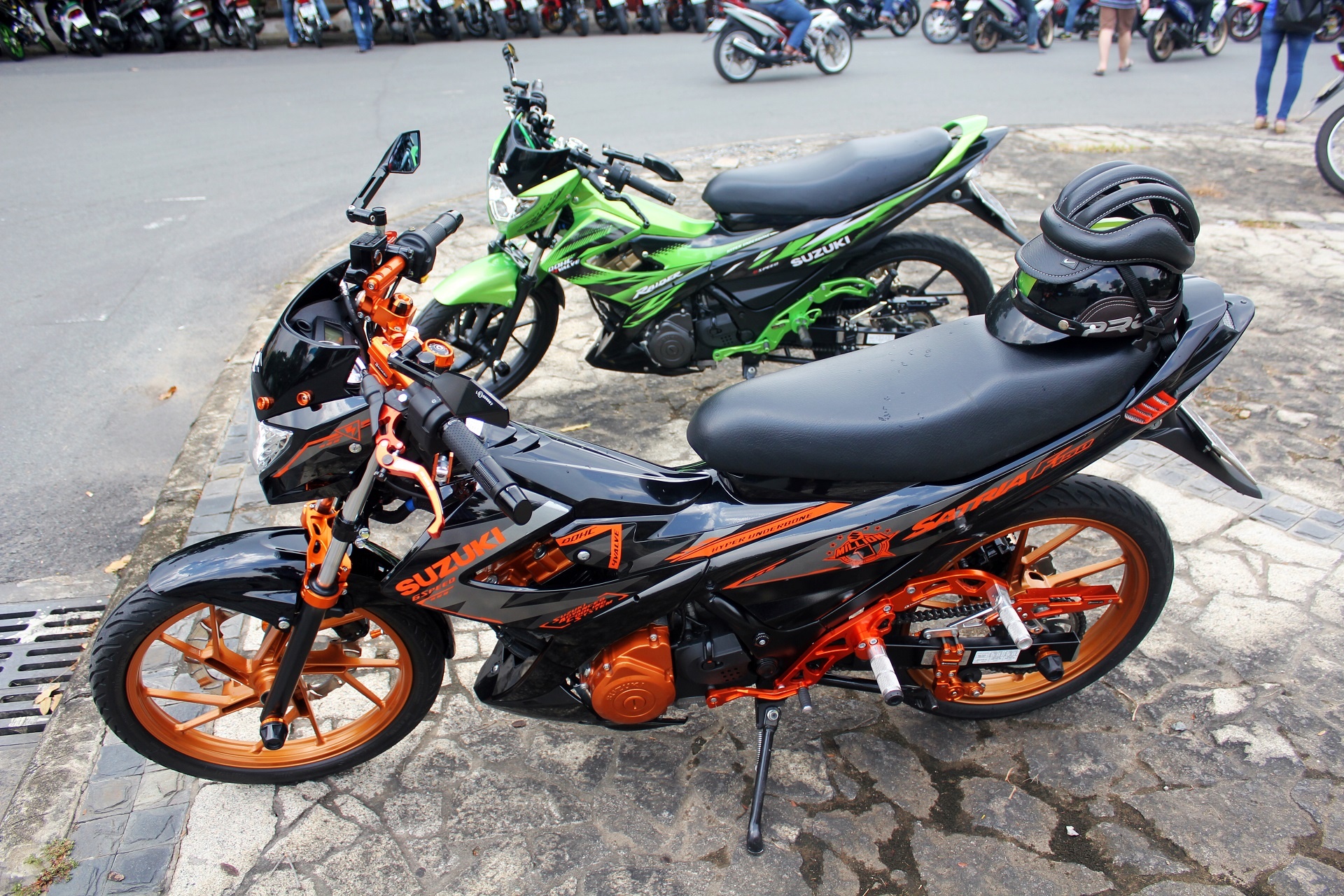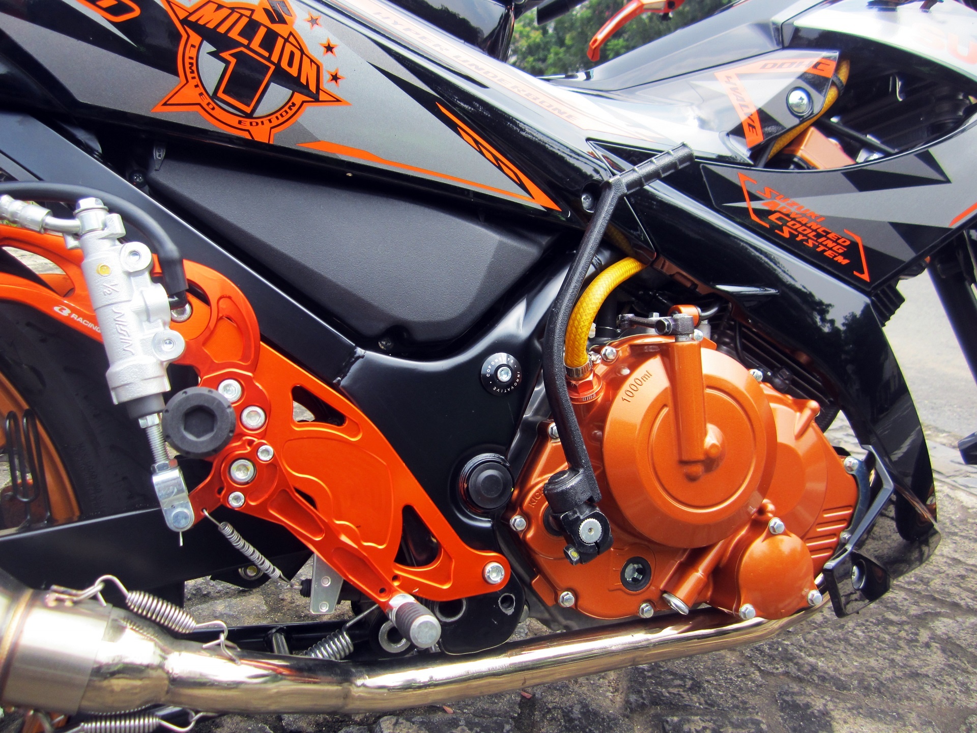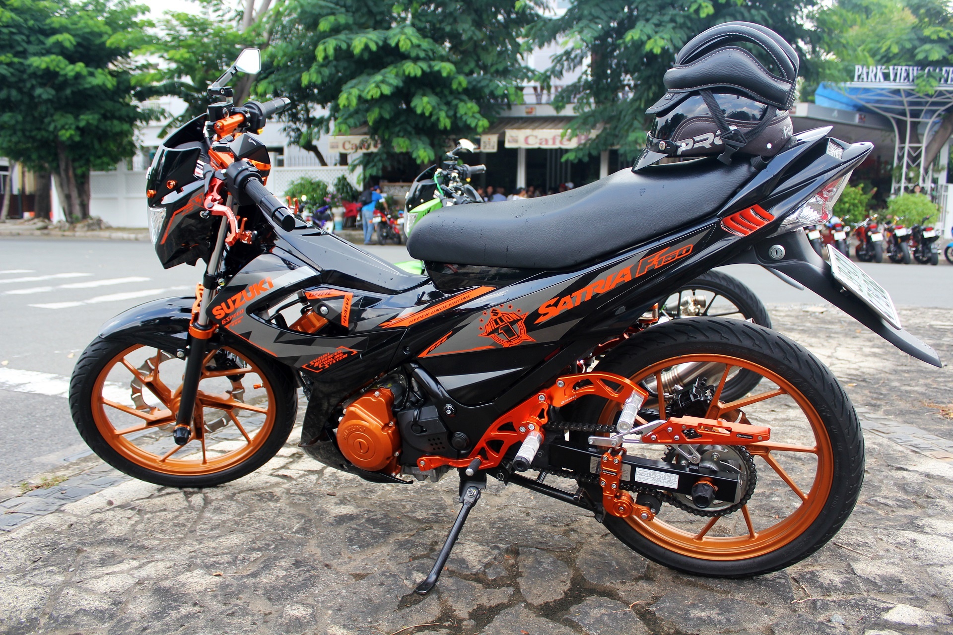 | Chiếc Satria màu cam - đen lên nhiều đồ chơi của Thái. Theo những người chơi xe, giá một chiếc Satria F150 nguyên bản hiện đã lên tới trên 90 triệu đồng. Chưa kể dàn đồ chơi hàng hiệu sẽ đội giá chiếc xe lên rất nhiều. |