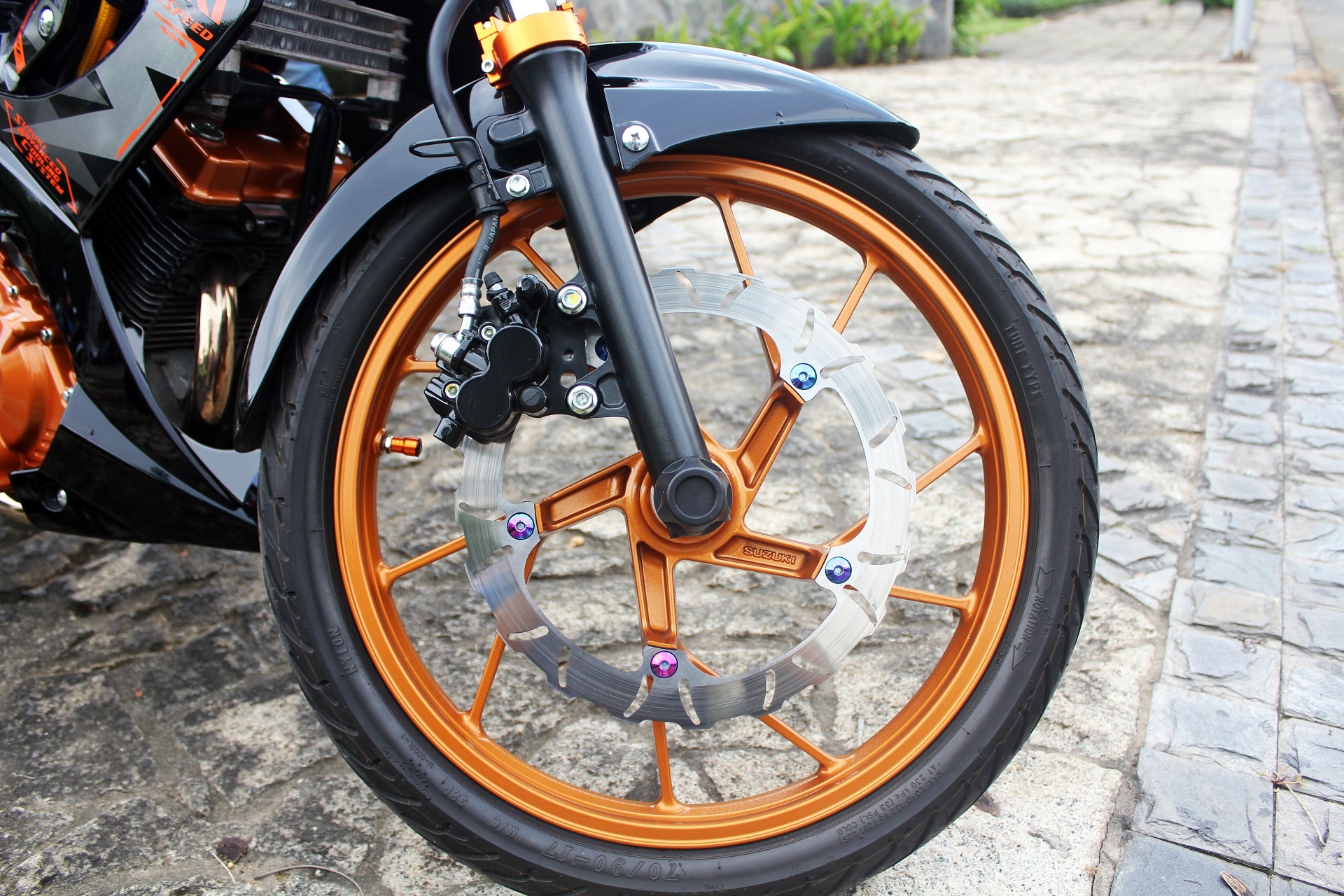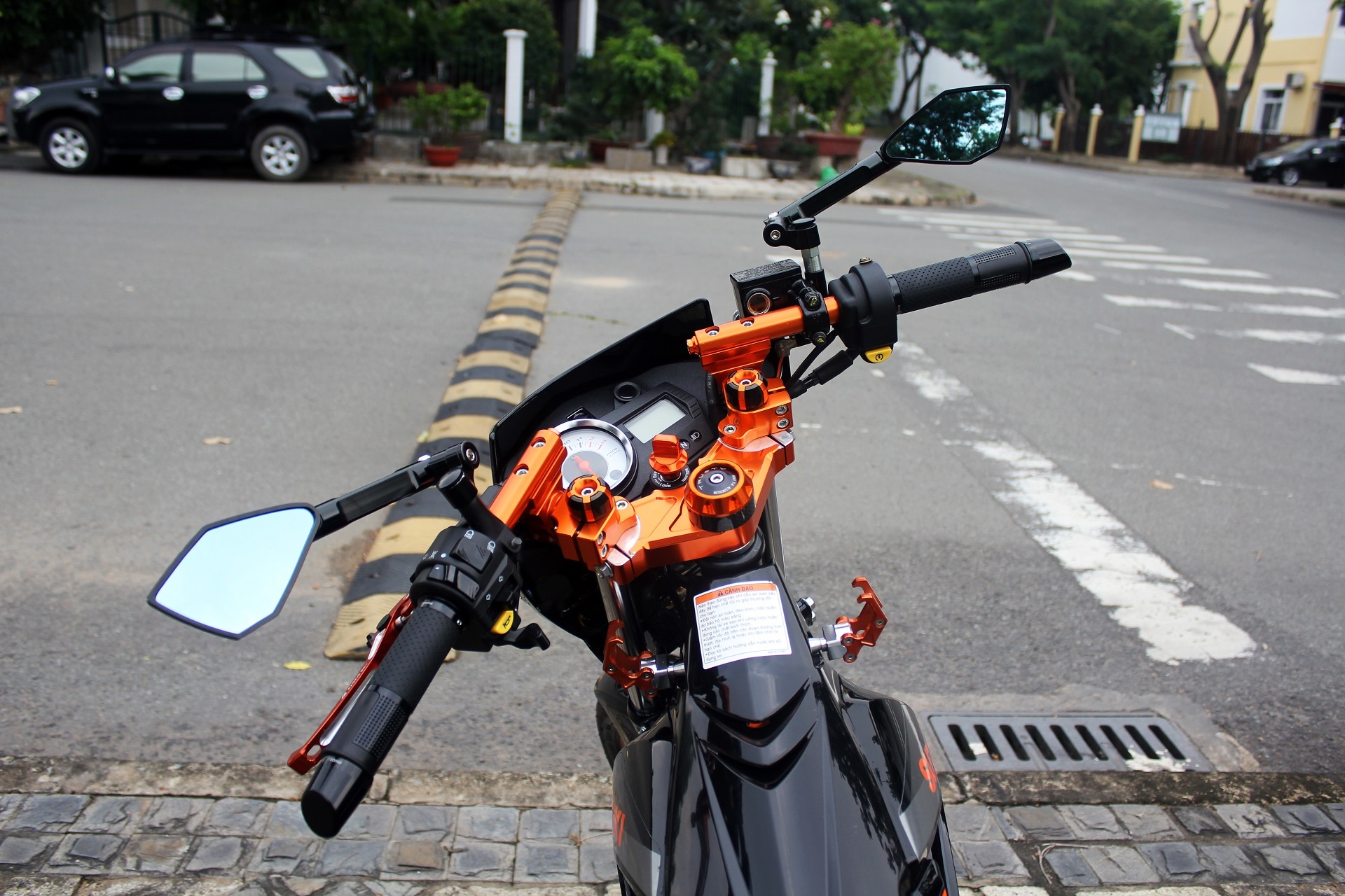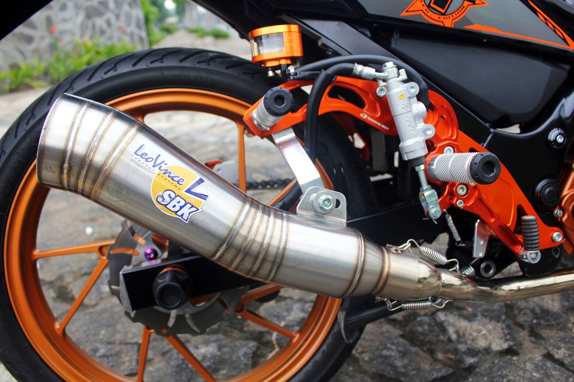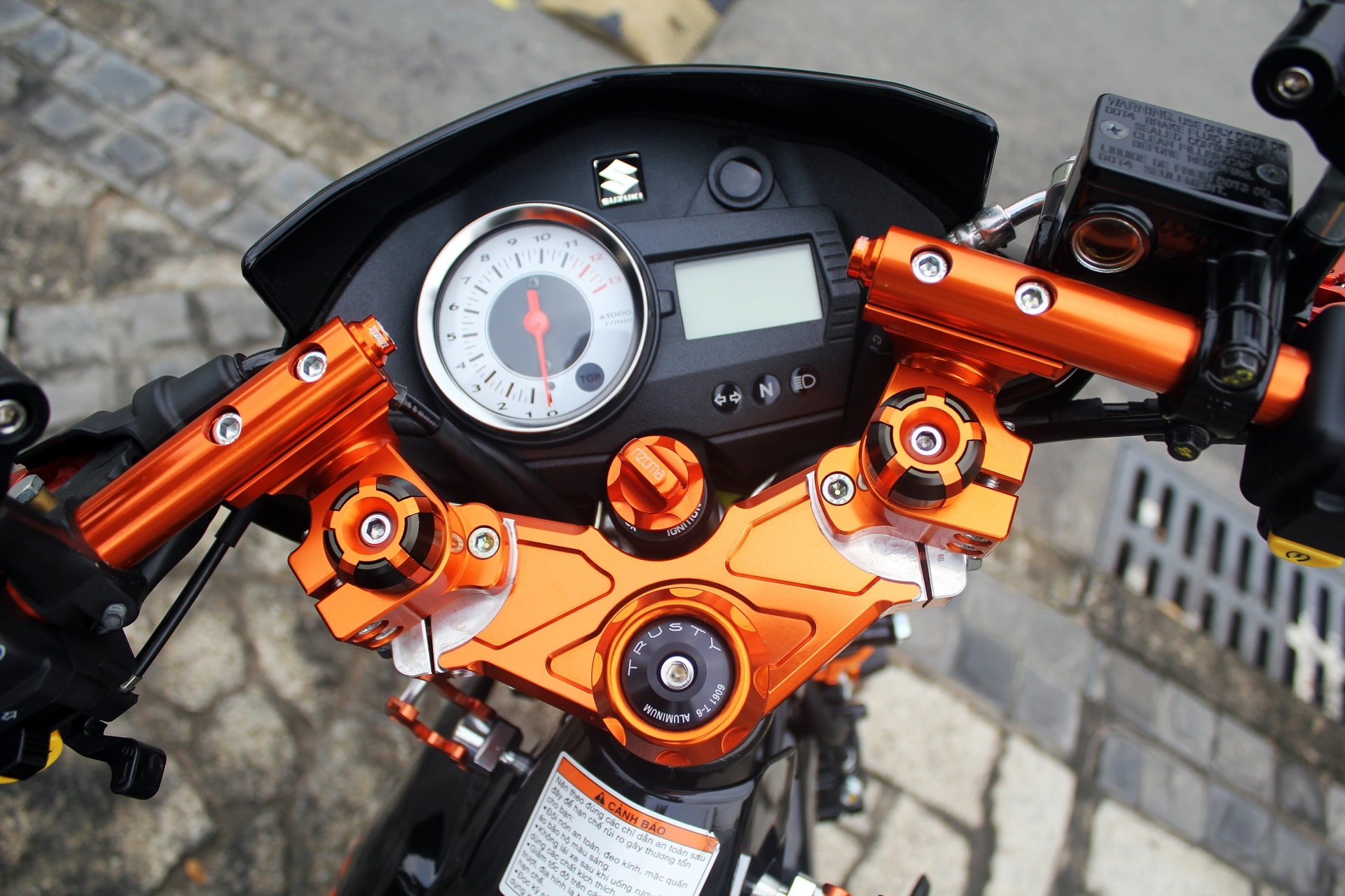 | Chiếc Satria màu cam - đen lên nhiều đồ chơi của Thái. Theo những người chơi xe, giá một chiếc Satria F150 nguyên bản hiện đã lên tới trên 90 triệu đồng. Chưa kể dàn đồ chơi hàng hiệu sẽ đội giá chiếc xe lên rất nhiều. |