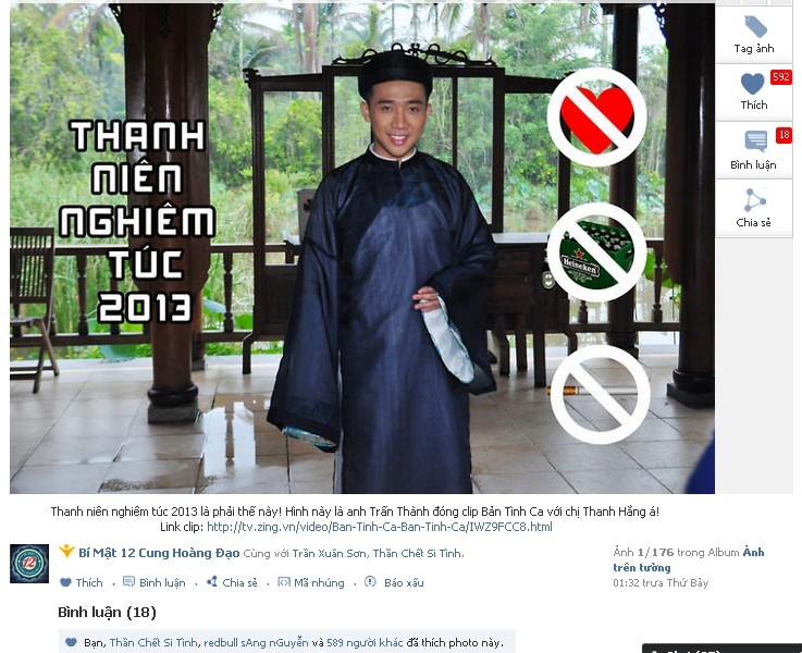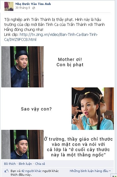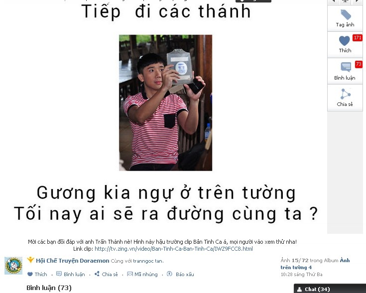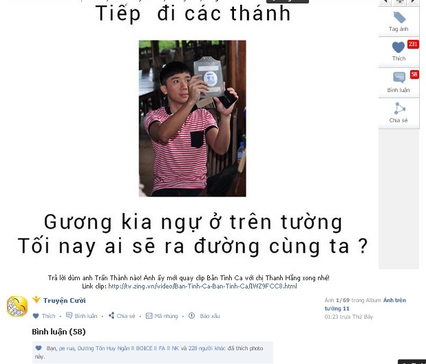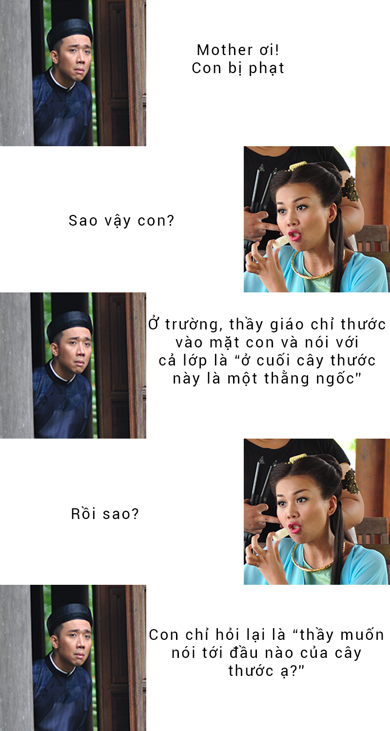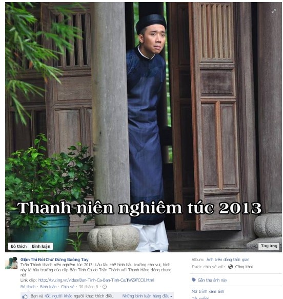 Điều thú vị là các ảnh chế đều lấy hình chụp ở phần hậu trường của cặp đôi này. Kiểu ảnh “tự sướng” soi gương kỹ càng trước khi quay của Trấn Thành được chèn thêm câu bình luận khá “hợp tình hợp cảnh” với khổ chủ: “Nhìn kỹ lại, mình cũng xinh trai phết”. Cư dân mạng cũng rất hài hước khi đưa một số vấn đề xã hội mà giới trẻ quan tâm thời gian qua làm nội dung ảnh, như Trấn Thành với tạo hình nghiêm túc như học sĩ được phong tặng danh hiệu “thanh niên nghiêm túc 2013”.