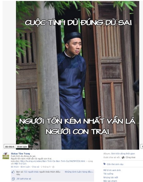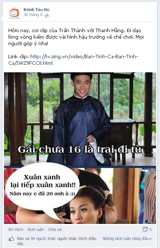 Nàng tiểu thư xinh đẹp còn bị chớp lấy khoảnh khắc “cười té ghế” khi ăn hoa quả trong bức ảnh đối thơ với học sĩ Trấn Thành. Tác giả đã rất khéo léo lồng ghép lời khuyên yêu đương đúng tuổi, đúng pháp luật với giới trẻ: “Cuộc tình dù đúng dù sai. Gái chưa 16 là trai đi tù”.